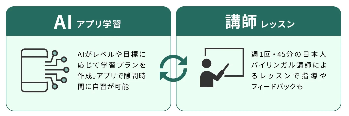 250万人の学習データを分析したAIによる精密なレベルの学習カリキュラムで、最適な学習ルートをご提案。さらに、日本人バイリンガル講師によるマンツーマンレッスンを組み合わせる事で、短期間で英語習得を目指します。