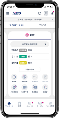 普段お使いの駅を登録すると、直近の電車の発車時刻が表示されます。さらに駅に関連するバス乗り場・バス時刻表や京王沿線クチコミ情報サイト「街はぴ」などの情報にも容易にアクセスできます。
