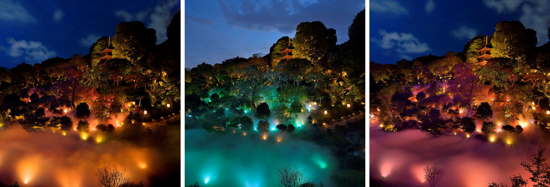 ロクシタンのミントヴァーベナの香りをのせた「香る、東京雲海」は1日6回。「薄いオレンジ色」から「薄紫・薄ピンク」、ついでサンセットが沈む際のような「濃いオレンジ」に変化するプロヴァンスのサンセットをイメージした「グラデーション東京雲海」は19時以降に1日4回登場します。通常の東京雲海と併せて3種類の東京雲海をお楽しみいただけます。