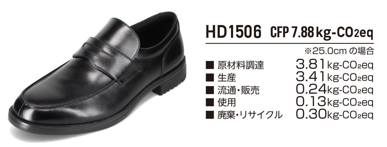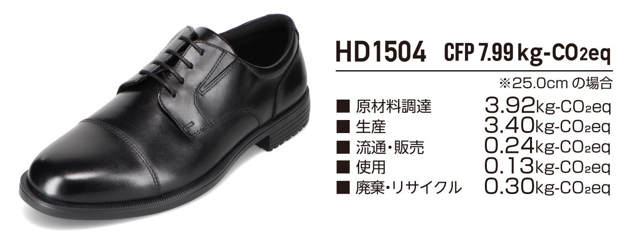 ※HD1504、HD1505、HD1506 全て25.0cmで算定。※端数処理により、数値の合計が若干異なる場合があります。※算定にはISO14067:2018ならびに経済産業省・環境省「カーボンフットプリント ガイドライン」を参照して作成した自社の算定ルールを使用。