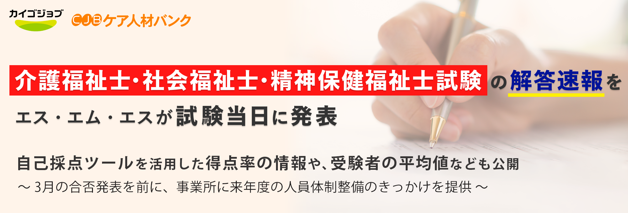 介護福祉士・社会福祉士・精神保健福祉士試験の解答速報をエス・エム・エスが試験当日に発表。自己採点ツールを活用した得点率の情報や、受験者の平均値なども公開