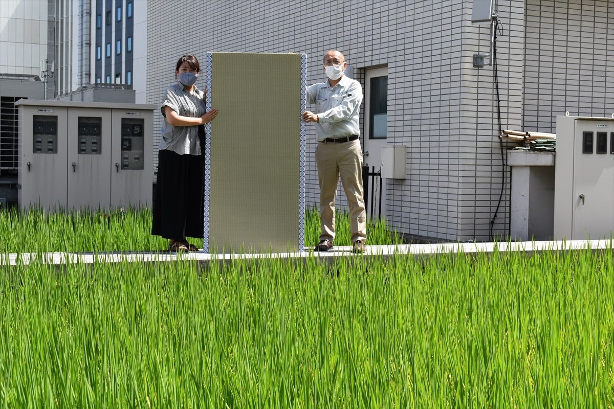 「白鶴銀座天空農園」で収穫した独自開発米「白鶴錦」の稲藁を岡田畳本店(埼玉県川越市)さまに畳にしていただきました。畳の芯になる素材(畳床)に稲藁が使われています。最近では畳床に木材ボードや発泡スチロールを使用したものが多く、稲藁を使った畳は高級品だそうです。[白鶴酒造資料館(兵庫県神戸市)に展示中]