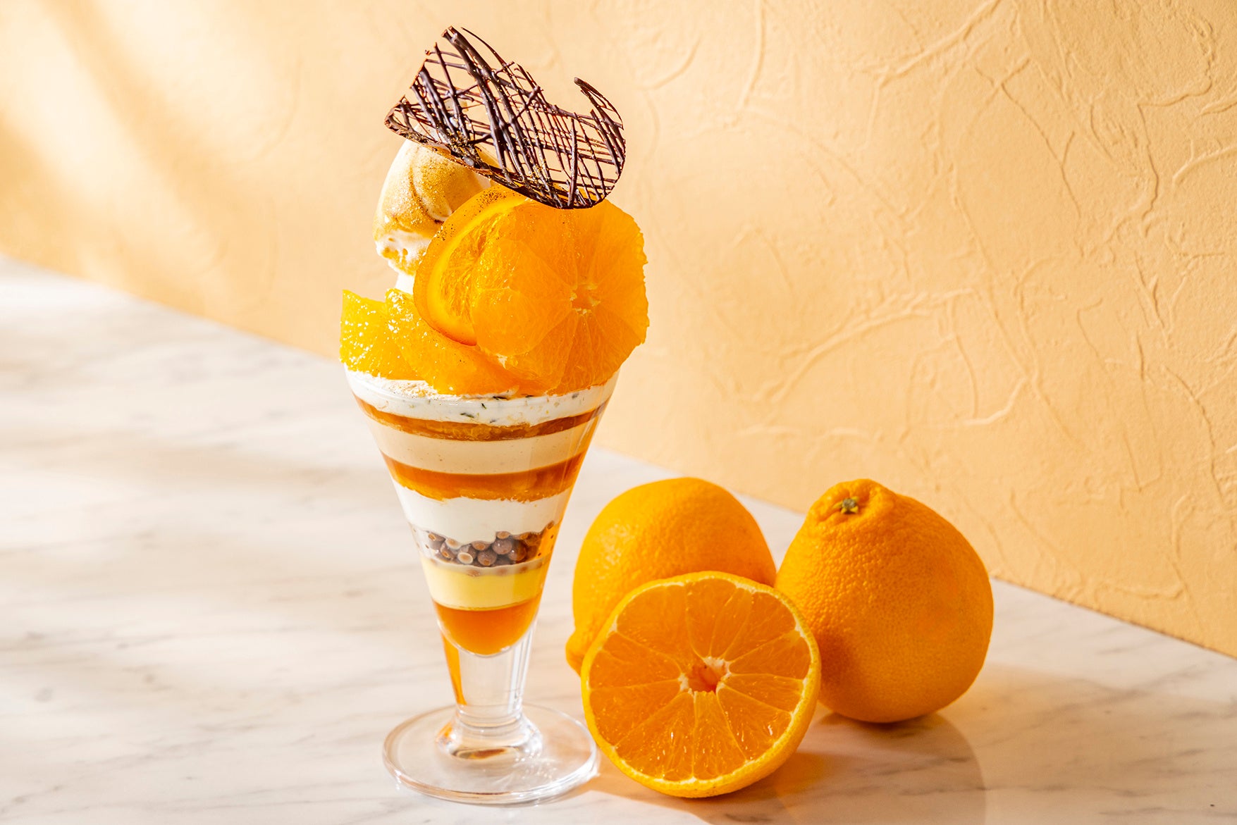 チョコレートパールクラッカンの軽やかな食感と、デコポンカスタードクリームがパフェ全体に奥行きを与え、一口ごとに上品な余韻を奏でます。はちみつの潤いと果汁が織りなす初夏の甘みを、余韻まで優雅にお楽しみいただけます。