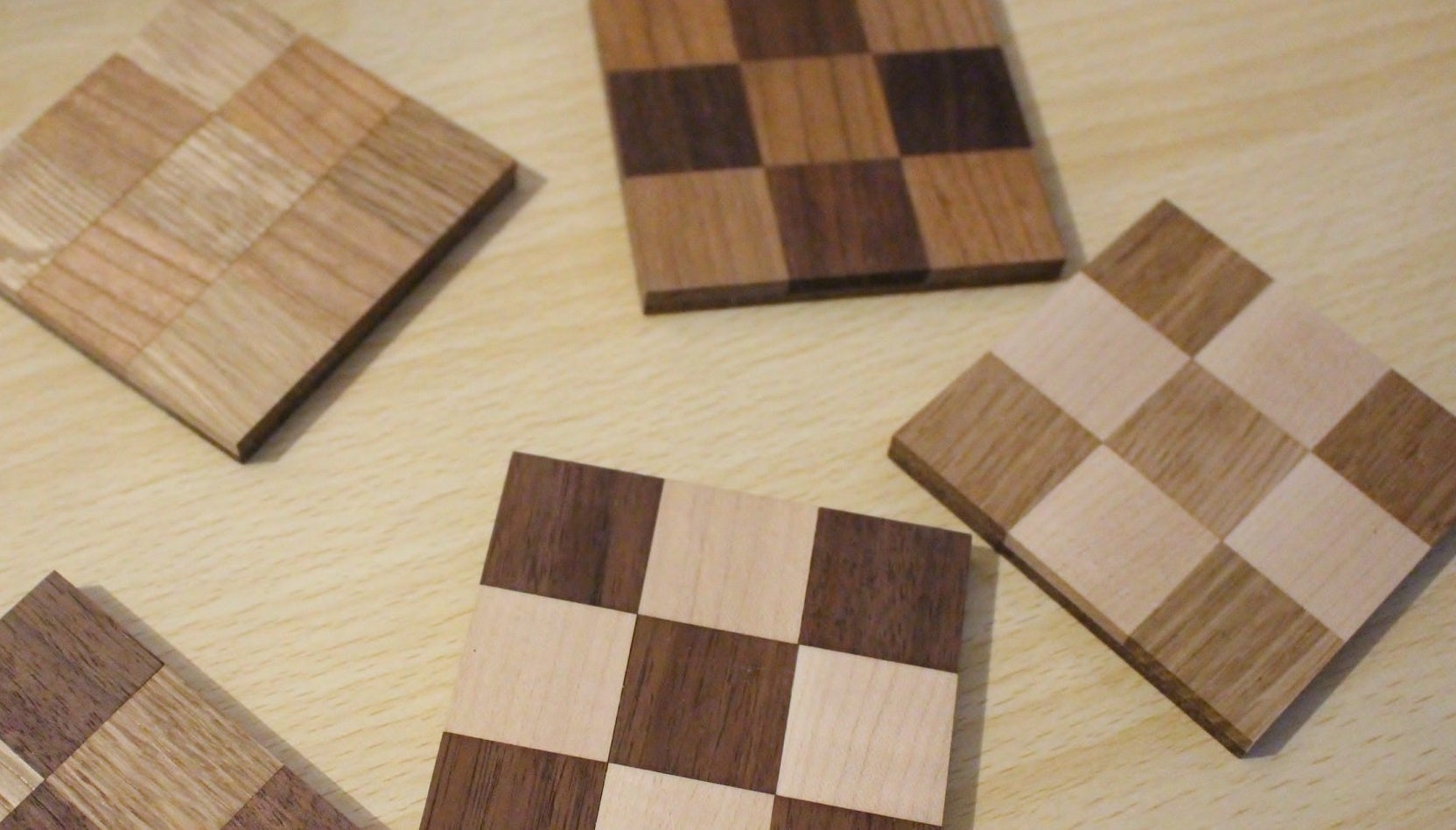 概 要:ウォルナット、ナラ、チェリーなどの木材を組み合わせて作るコースター。好きなパーツを張り付けてヤスリで磨き、最後にくるみからオイルを抽出して塗装します。