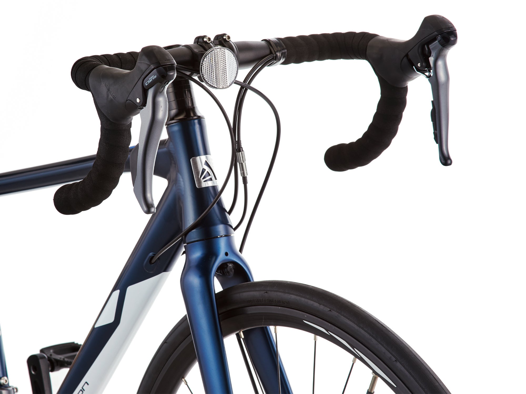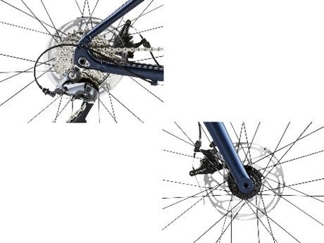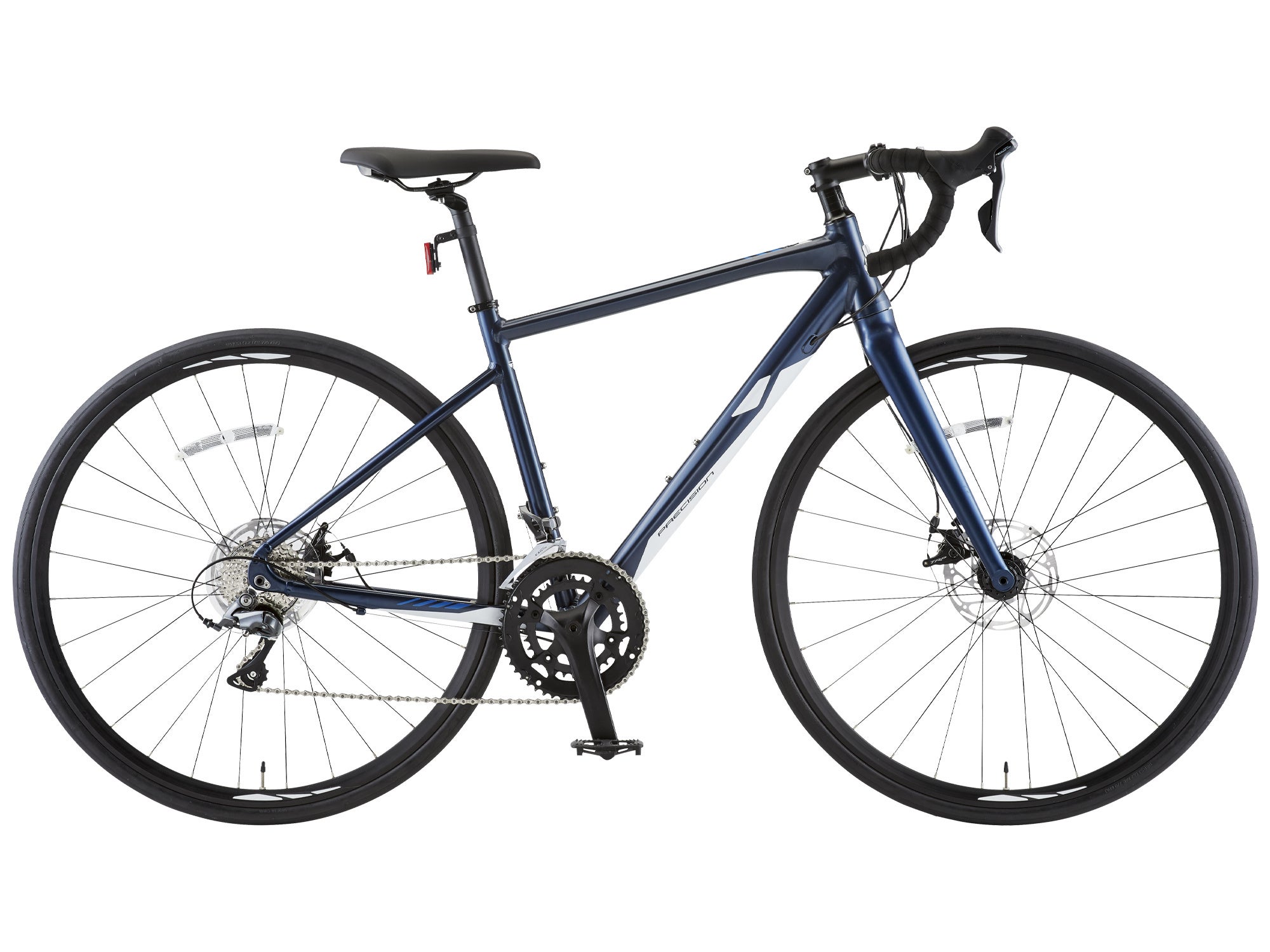 車体には軽量なアルミ素材を採用し、ロードバイクにありがちな前傾のきつい姿勢ではなく楽に乗車できるよう設計しているため、初めてロードバイクに乗る方も気軽にスポーティな走りを楽しめます。また、急な停止や下り坂、悪天候時でも確実な制動力を発揮するディスクブレーキを採用しており、安全かつ快適にロードバイクを楽しむことができます。メインコンポーネントには優れた操作性を誇る信頼のシマノ社製「CLARIS」を採用。その他、お尻の痛みや手のひらへの負担を軽減する振動吸収ゲルを内蔵したサドルとバーテープを採用し、ワンランク上の走りに快適性を加えた、ロードバイクビギナーにぴったりな一台です。