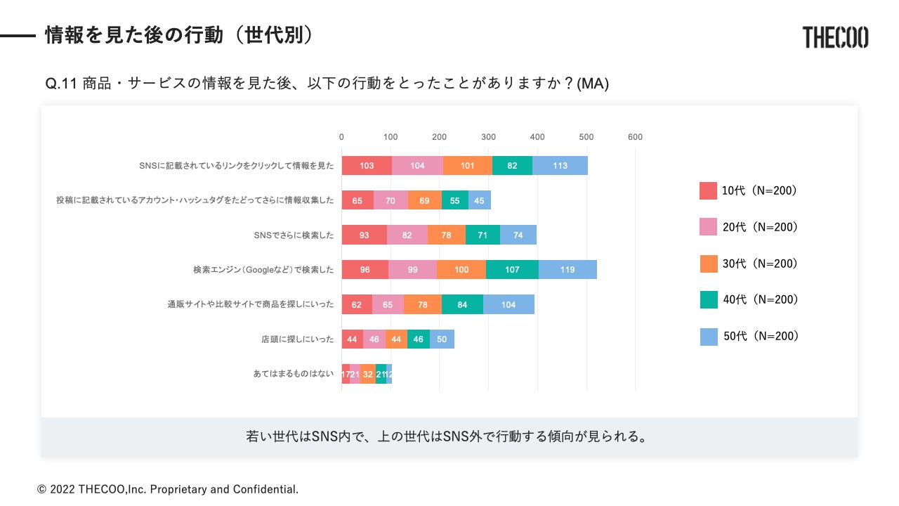 「商品・サービスの情報を見た後、以下の行動をとったことがありますか?」という質問で、情報収集後の行動を尋ねたところ、「検索エンジン(Googleなど)で検索した」が52.1%、「SNSに記載されているリンクをクリックして情報を見た」が50.3%と半数を超える結果となりました。