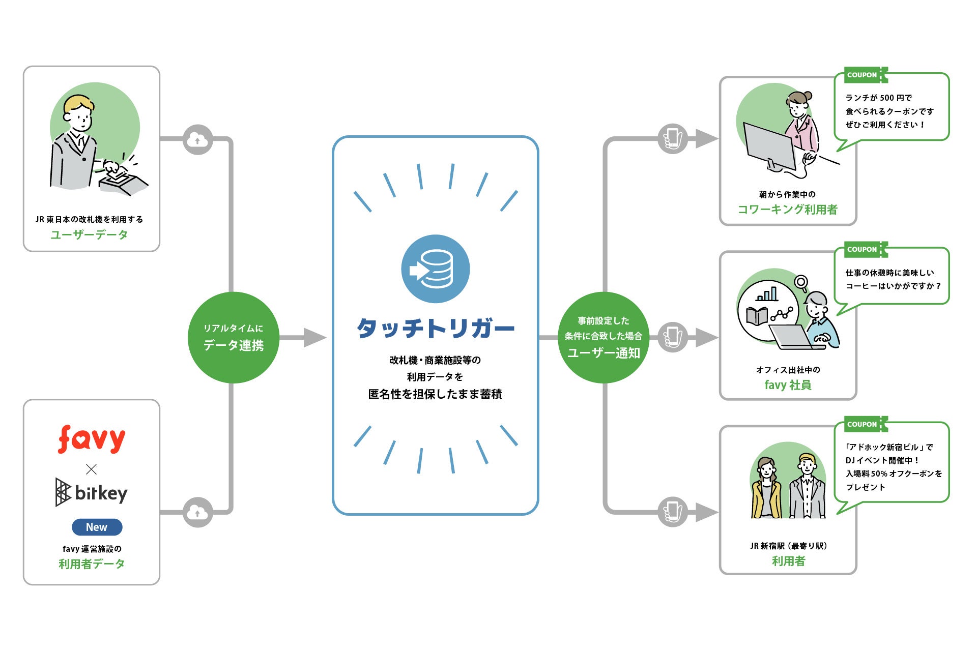 ・タッチデータの利用については、タッチトリガーを導入するサービスにおいてお客さまより同意をいただいたうえで、施設利用の傾向分析やクーポン配信等の目的で活用されます。