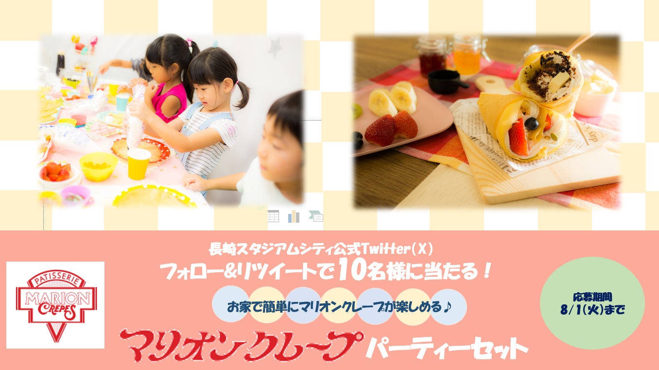 長崎スタジアムシティプロジェクト公式Twitter(X)より発信する投稿を「フォロー&リツイート」いただくと、抽選で10名様に「マリオンクレープ パーティーセット」をプレゼントいたします! 詳細は、当選者にDMにてお伝えさせていただきます。