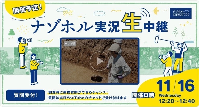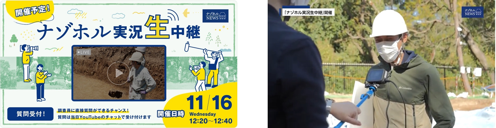 月に2回、双方向通信により、視聴者からの質問にお答えしながら発掘調査の解説を行う全国初のライブ配信(次回配信:令和4年11月16日 水曜日 12時20分開始)や、一週間ごとの調査成果をまとめたウィークリーハイライト動画配信、調査現場の定点カメラからリアルタイムに発掘調査の様子を公開する等、動画を活用した情報発信を行なっています。