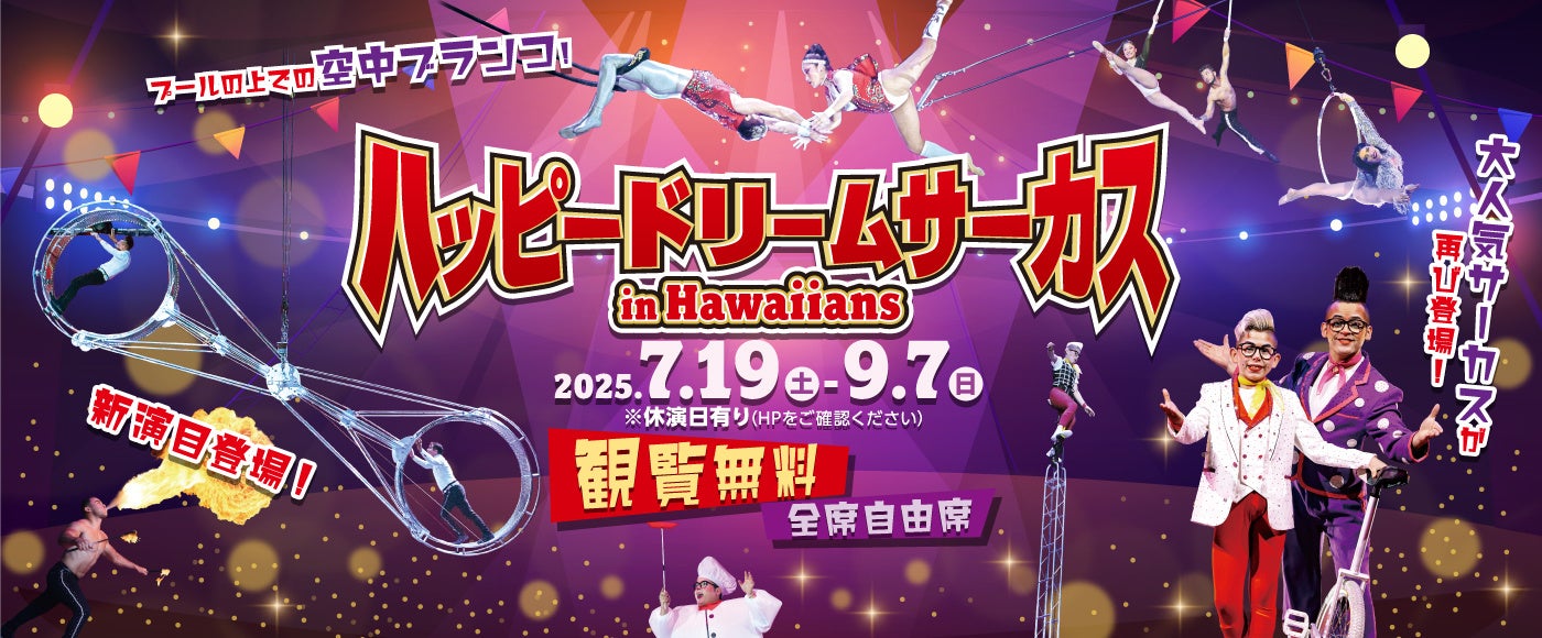 常磐興産株式会社(本社:福島県いわき市)が運営するスパリゾートハワイアンズでは、夏休みの特別イベントとして「ハッピードリームサーカス in ハワイアンズ」を2025年7月19日(土)から9月7日(日)までの間、毎日2回公演いたします。