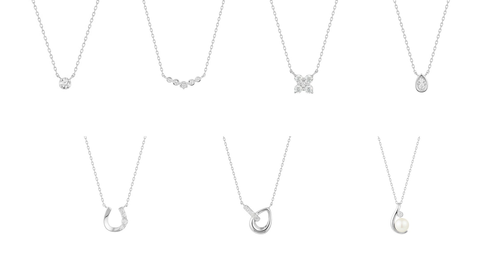 全7種類のネックレスは、一粒ダイヤをあしらったシンプルなデザインから、ボリューム感のある馬蹄やしずくモチーフのデザインまで、幅広くご用意しています。プラチナコーティングを施したシルバーカラーの地金と上質な輝きを放つダイヤモンドの組み合わせが、コーディネートをさらに上品な印象に仕上げてくれます。