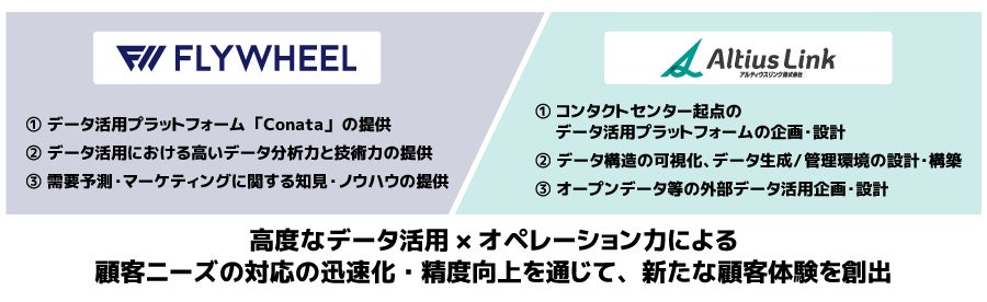 フライウィールの高い分析力と技術力、データ活用ノウハウと、アルティウスリンクの国内最大規模のコンタクトセンター運営ノウハウを掛け合わせ、Altius ONEにおけるデータ活用のさらなる高度化、新たな価値創出実現に向けて本提携にいたりました。