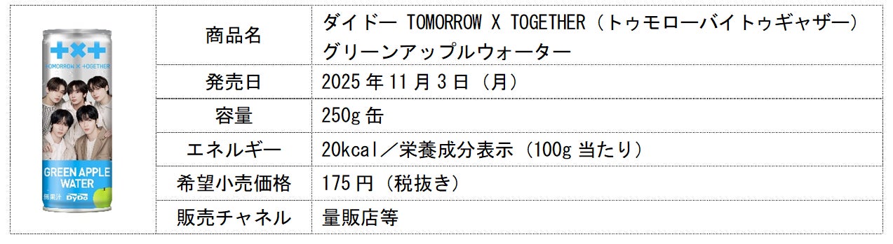 ダイドードリンコ株式会社(本社:大阪市北区、代表取締役社長:中島 孝徳、以下「当社」)は、2025年秋冬の新商品として、「ダイドー TOMORROW X TOGETHER(トゥモローバイトゥギャザー)グリーンアップルウォーター」を、自動販売機では10月20日(月)より、量販店等では11月3日(月)より期間限定で発売※いたします。