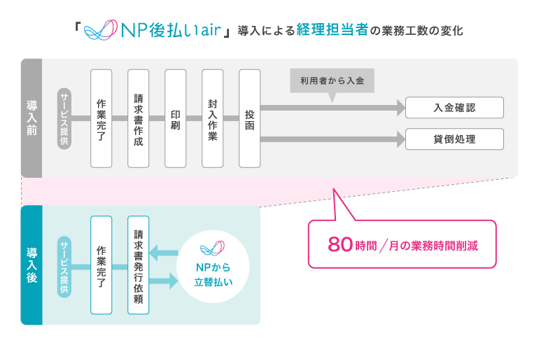 1.「NP後払いair」の導入により、与信や請求書発行、集金業務、入金管理、督促といったこれまで自社で行っていた作業をまるごと委託することができるようになり、請求業務にかかる手間が大幅に削減!