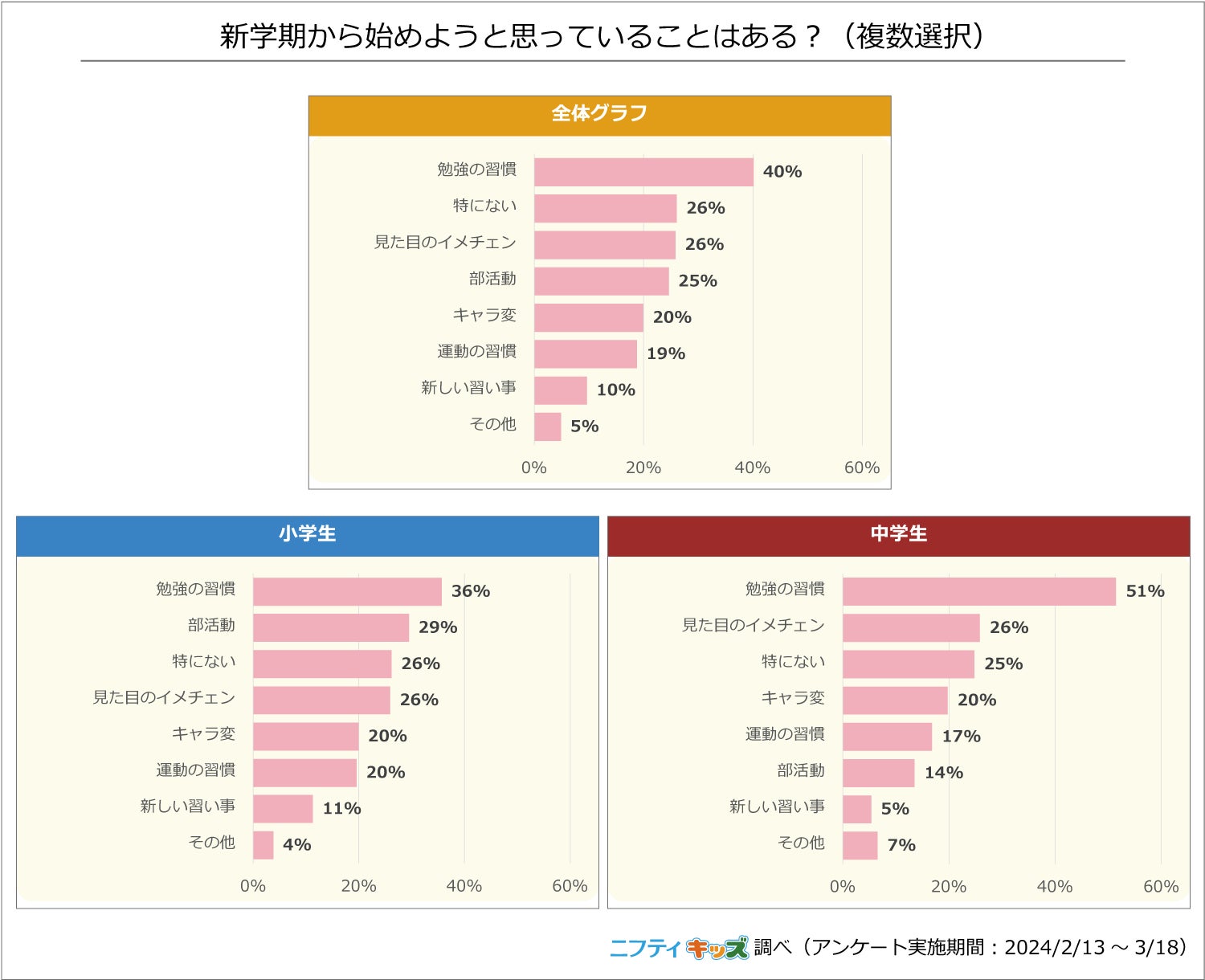 また、「見た目のイメチェン」や「キャラ変」と回答もあり、新学期を迎えたタイミングで新しい自分になりたいと考える人も多いことがわかりました。