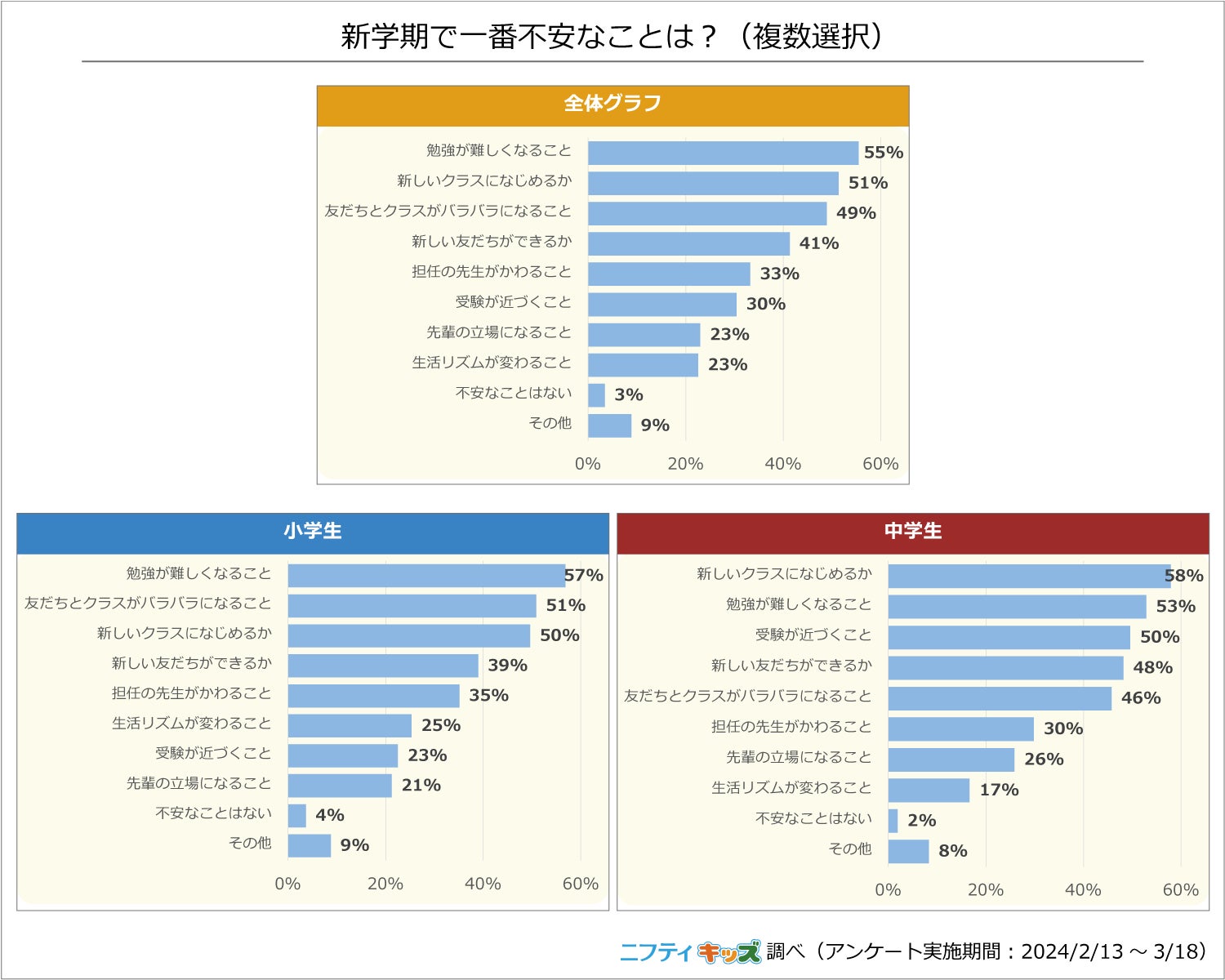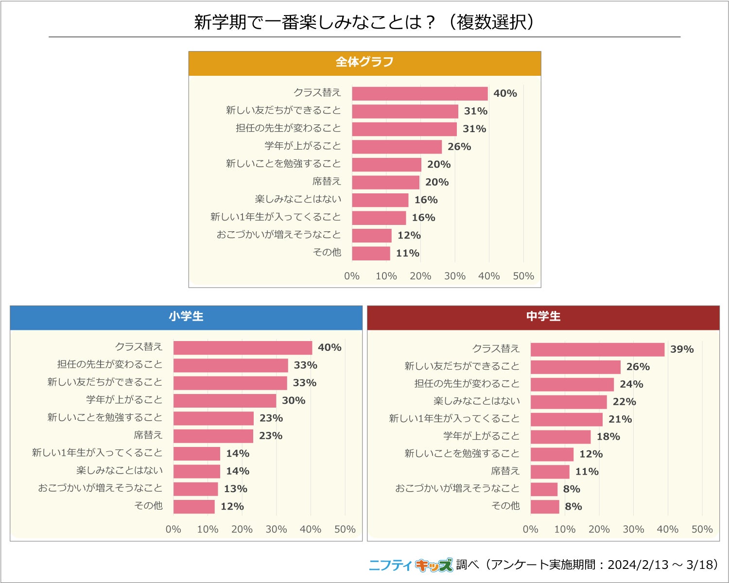新学期で一番楽しみなことは、小中学生ともに「クラス替え」が1位、新学期で一番不安なことは、「勉強が難しくなること」「新しいクラスになじめるか」が上位でした。