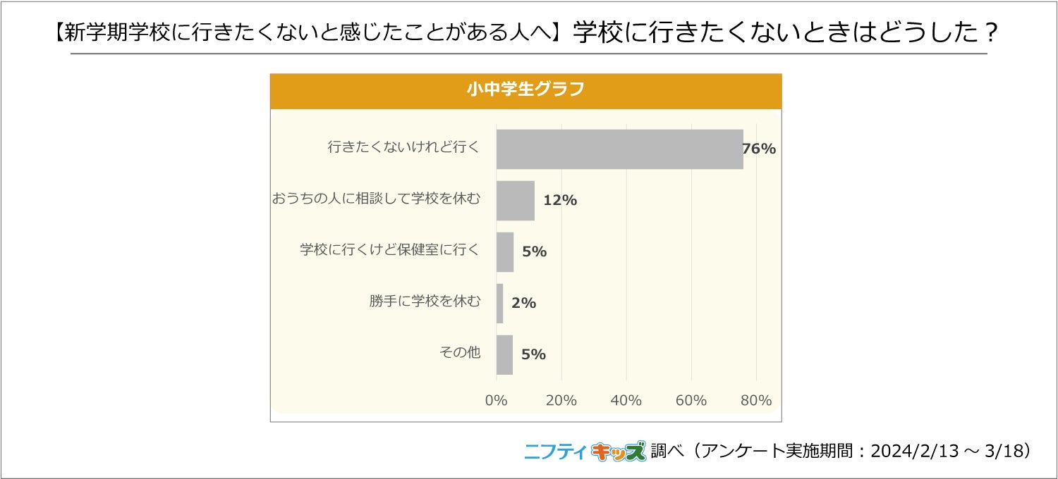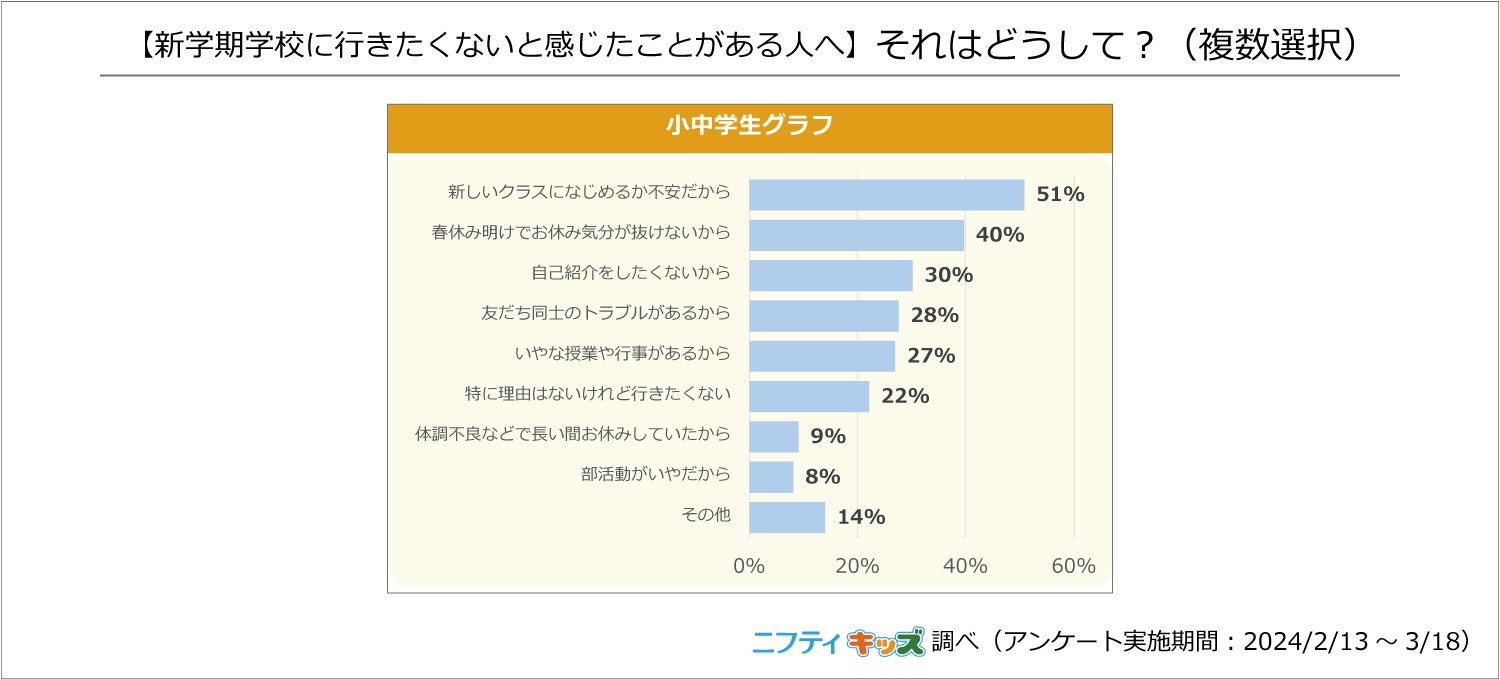 小学生・中学生のどちらも、半数以上が「新学期に学校に行きたくない」と感じたことがあるようです。
