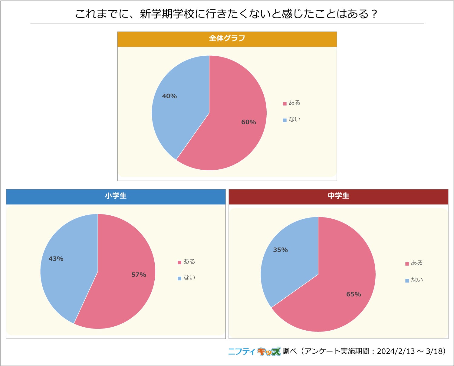 また、新学期に学校に行きたくないと感じたことがある人が、小学生で57%、中学生で65%いることがわかりました。