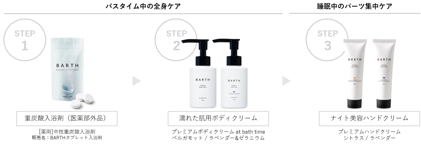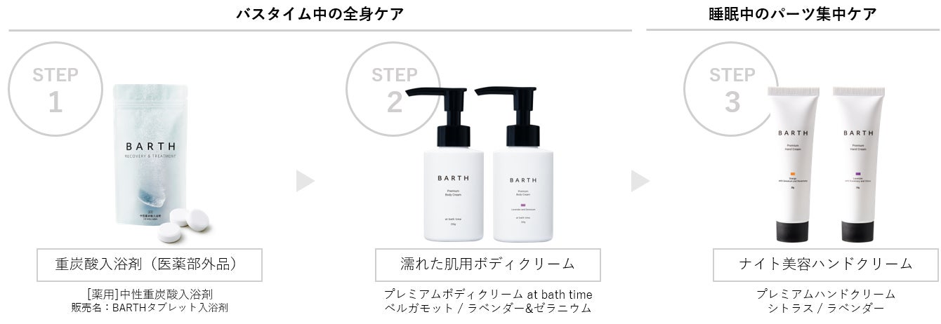 BARTHは、バスタイムからスリープタイムまでワンランク上のナイトルーティンを提案するナイトウェルネスブランドです。世界でも希少な中性重炭酸泉から着想を得た『薬用BARTH中性重炭酸入浴剤』をはじめとして、ナイトタイムを充実させるプロダクトを展開。“入浴”や“睡眠”といった何気ない日々の暮らしにワンエッセンス加えるだけで満たされる、プレミアムなナイトケア体験を提供します。