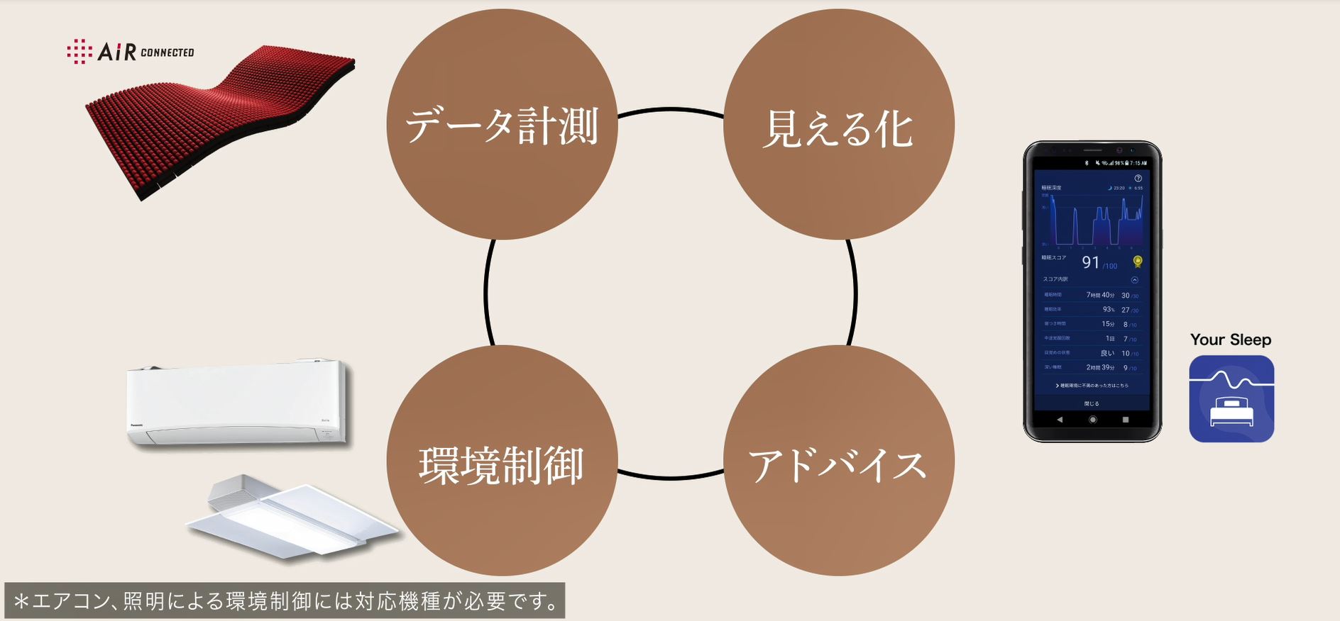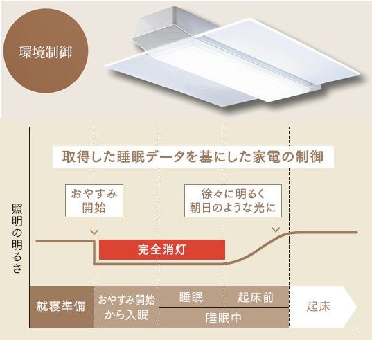 睡眠の状態にあわせて家電を制御。睡眠の結果を可視化し、一人ひとりにあった睡眠のアドバイスを行い、よりよい睡眠環境へアップデート