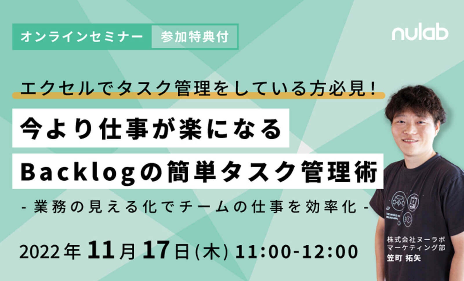 「“このチームで一緒に仕事できてよかった”を世界中に生み出していく。」をブランドメッセージとし、チームのコラボレーションを促進し、働くを楽しくするツール「Backlog」「Cacoo」「Typetalk」「Nulab Pass」を提供する株式会社ヌーラボ(本社:福岡県福岡市、代表取締役:橋本正徳、以下 ヌーラボ)は、エクセルやメールでプロジェクト管理をしている方向けのオンラインセミナーを、11月17日(木)11:00より開催します。