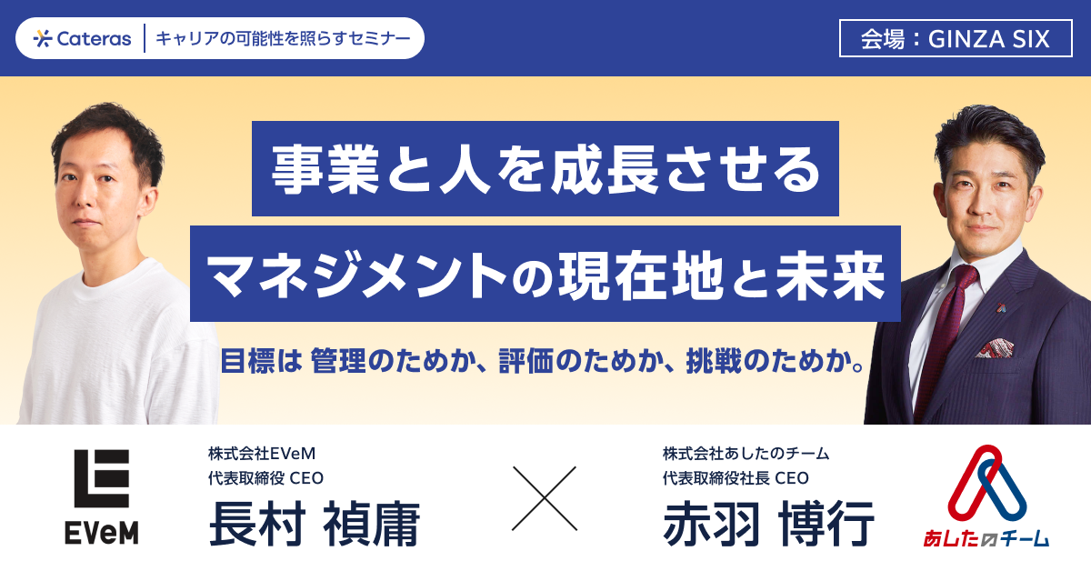 【共催セミナー】社員の目標は何のため? マネジメントのスペシャリスト・株式会社EVeM 長村禎庸氏 × 人事のプロ・株式会社あしたのチーム 赤羽博行が“事業と人を成長させるマネジメント”を徹底討論!