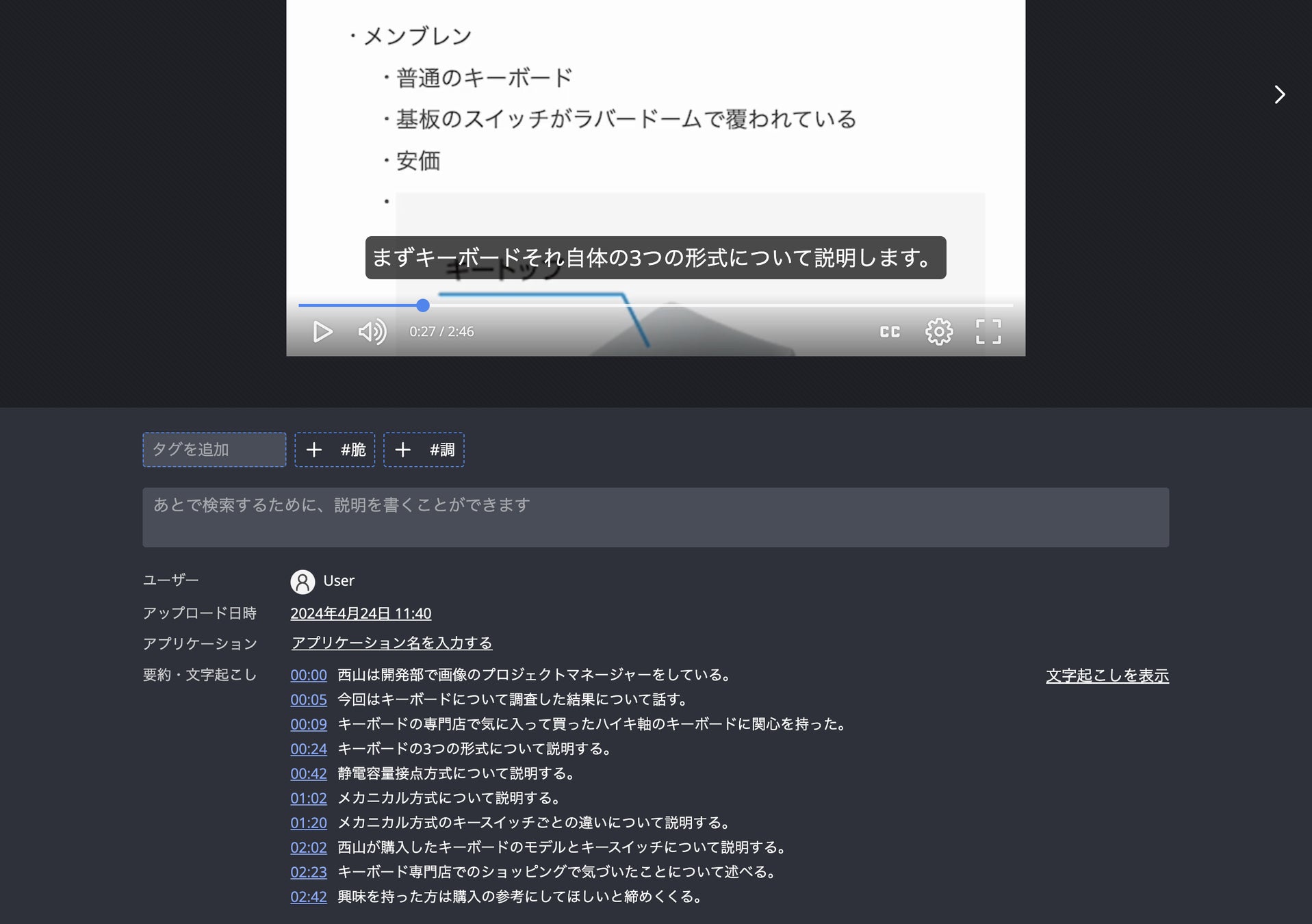 最新のAIの力で、動画の文字起こしとチャプター単位の要約を自動生成します。字幕や検索機能によって誰もがコンテンツにアクセスできるようにします。