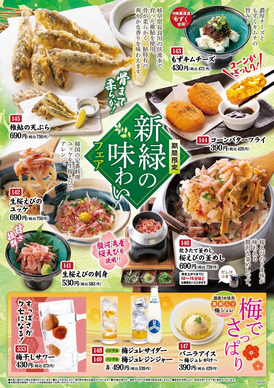 「くつろぎ」の空間を提供し、お食事を楽しんでいただく居酒屋「とりあえず吾平」では「新緑の味わい」フェアを5 月21日(水)より期間限定で開催いたします。骨まで柔らかい稚鮎の天ぷら、風味豊かな生桜えび、そして、初夏にぴったり、梅ジュレ入りドリンクなど10種類の季節メニューをご用意いたしました。どうぞ、この機会にご利用ください。皆様のご来店をスタッフ一同お待ちしております。