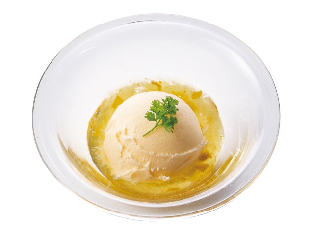 バニラアイスに梅ジュレをかけちゃいました.バニラアイスの甘味と梅ジュレのさっぱりした味わいをお楽しみください。