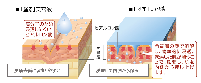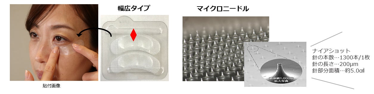 従来肌に浸透(※3)しづらかった美容液を、貼るだけで深層部(※1)に直接届けることを可能にした、針状に結晶化(マイクロニードル化)したシート美容液のこと。皮膚に貼ることで角質層に刺さり、肌の水分でゆっくりと溶解し、肌深部(※1)に浸透します。