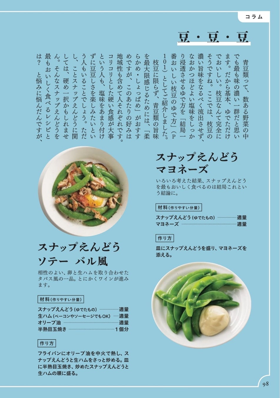 稲田「確かに、その野菜を主役として、一番おいしく食べるにはどうするかをすごく考えましたね。そうやって考えに考えた末ですね、結果的に“スナップエンドウマヨネーズ添え”ってレシピを載せました。これをレシピとして載せている本は僕が知る限りないですよ。」