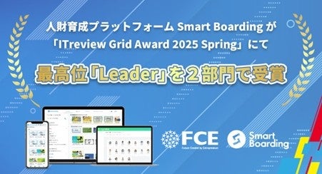 株式会社FCE(本社:東京都新宿区、代表取締役社長:石川淳悦、証券コード9564)が提供する「Smart Boarding 」は、アイティクラウド株式会社が主催するアワード「ITreview Grid Award 2025 Spring」において、「LMS/eラーニングシステム」「オンライン研修」の2部門で、満足度・認知度ともに優れた製品と評価され、最高位である「Leader」を受賞いたしました。