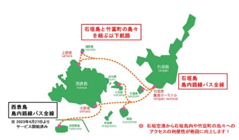 東運輸、西表島交通、カリー観光が運行する路線バス全線、安栄観光、八重山観光フェリーが定期便を運航する全航路