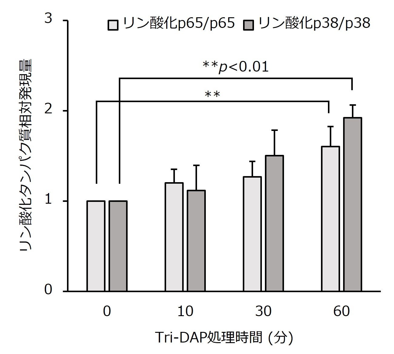 次に、ヒト皮脂腺細胞に発現するNOD1およびNOD2が免疫応答に寄与するのか調べるために、NOD1作動薬であるTri-DAP※2またはNOD2作動薬であるMDP※3で細胞を刺激して、炎症性サイトカインの1種であるIL-8が誘導されるか調べました。Tri-DAPによる刺激は濃度依存的にIL-8の産生を誘導したのに対し、MDPによる刺激はIL-8の産生を誘導しませんでした(図4)。さらに、Tri-DAPによる刺激は、免疫応答において中心的な役割を果たす転写因子であるNF-κB※4のサブユニットp65とMAPK※5の1種であるp38のリン酸化を誘導しました(図5)。