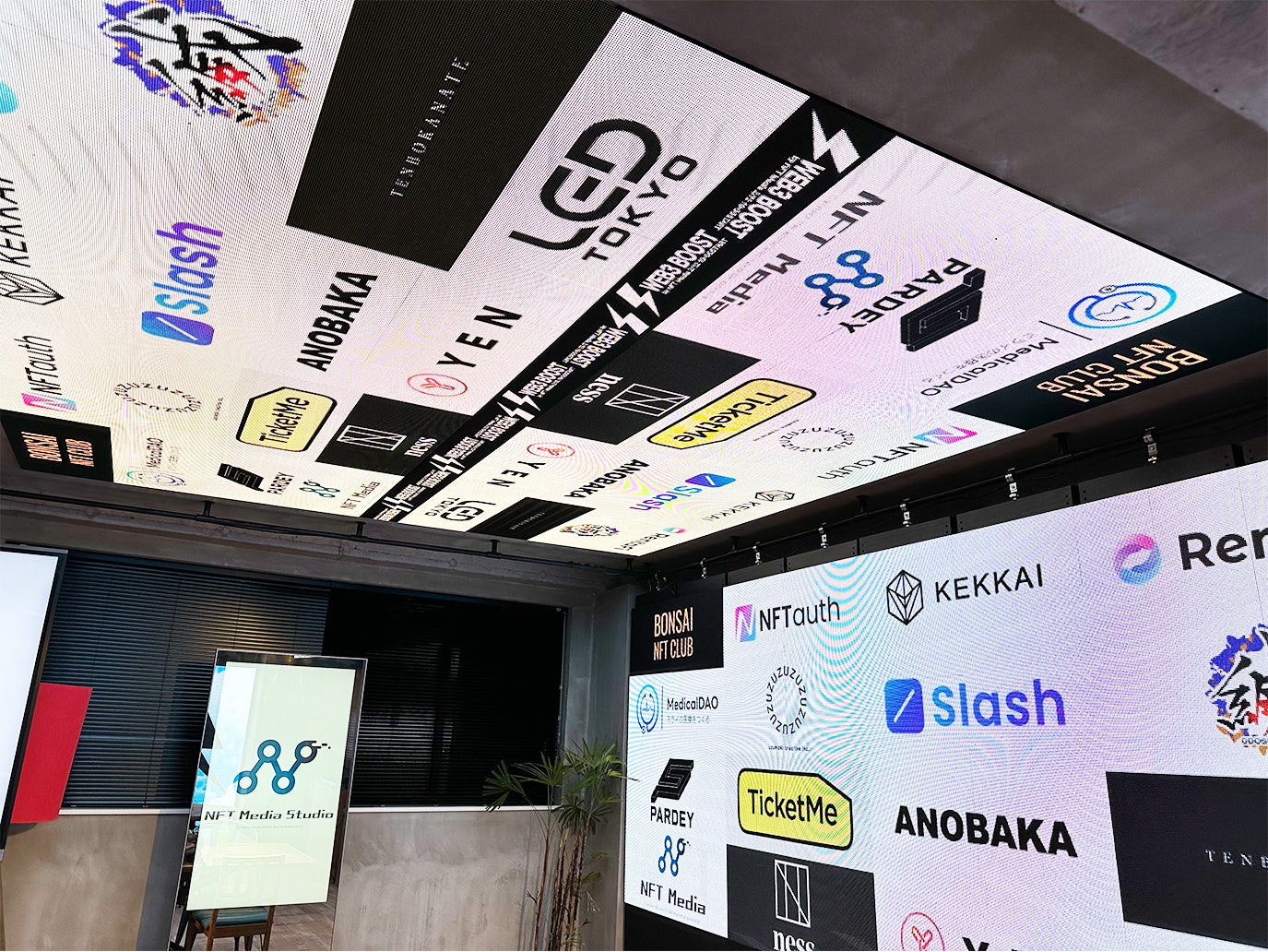 NFT Media Studioは天井、床、壁面全てがLEDビジョンで構成されているイベントスペースです。NFTMedia主催イベントをはじめ、NFTプロジェクトタイアップイベントなども積極的に開催予定です。