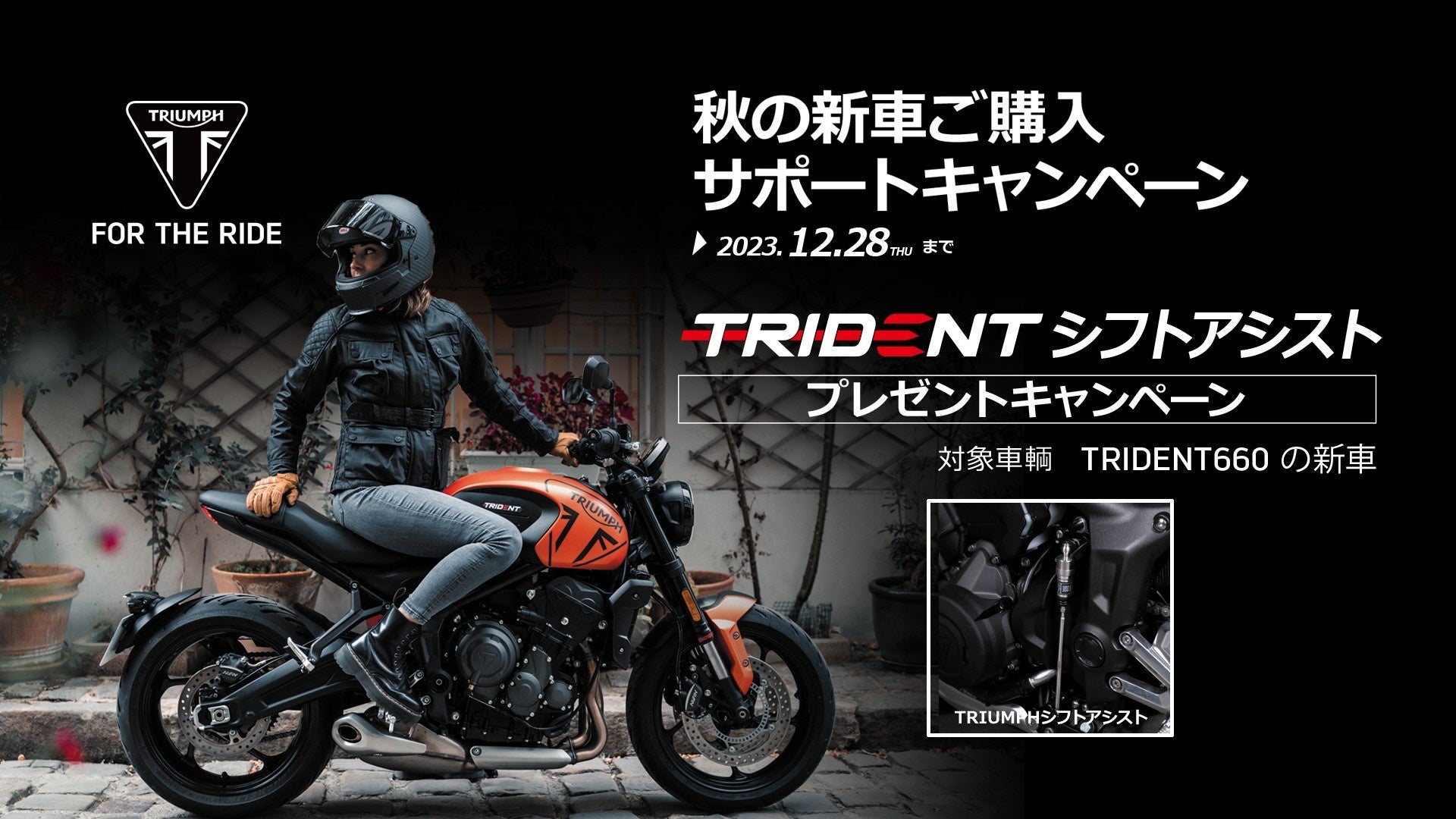 内容:キャンペーン期間中、全国のトライアンフ正規販売店にて対象車両をご成約していただいたお客様へ「Trident 660用トライアンフ シフトアシスト」をご提供いたします。