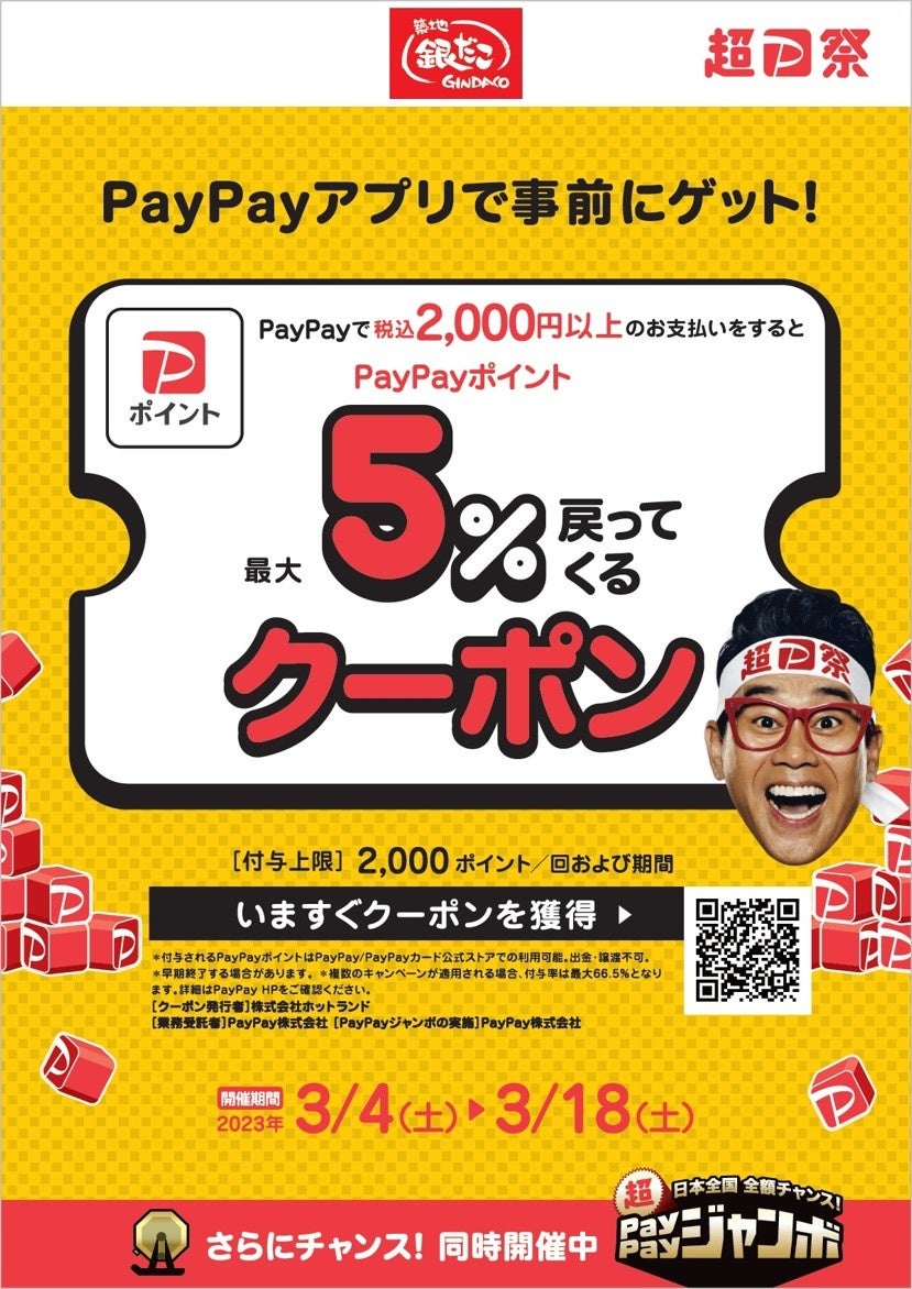 さらに!3月4日(土)から18日(土)の期間、最大5% 戻ってくる!クーポン の配布(※4)を実施いたします。 PayPayアプリで事前にクーポンをゲットし、築地銀だこの対象店舗にて2,000円(税込)以上のお買い上げをPayPayでお支払い(※5)いただくと、最大5%のPaypayポイントが戻ってきます!