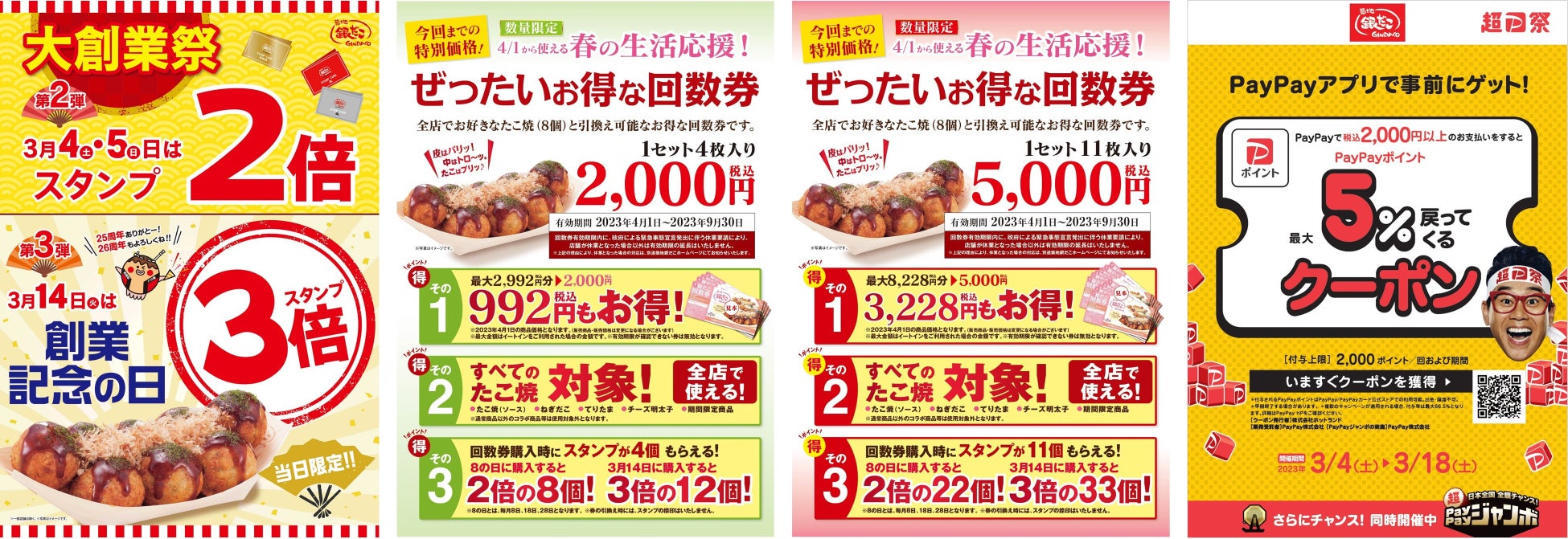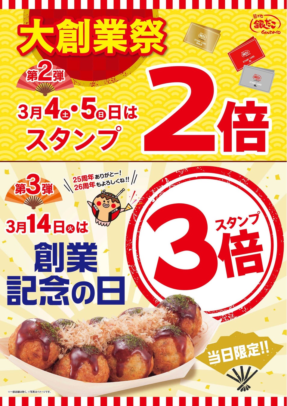 また、3月1日から築地銀だこ店舗(一部店舗を除く)にて開催している 『大創業祭』 の 第2弾(3月4日、5日)、第3弾(3月14日)及び3月8日・18日(8のつく日) に “ぜったいお得な回数券” をご購入いただくと、ご購入時に 「銀だこスタンプカード(※3)」 のスタンプも2~3倍もらえて “超お得” !!(3月4日(土)、5日(日)、8日(水)、18日(土)に購入するとスタンプ2倍!、3月14日(火)の創業記念日に購入すると、なんとスタンプ3倍!!)