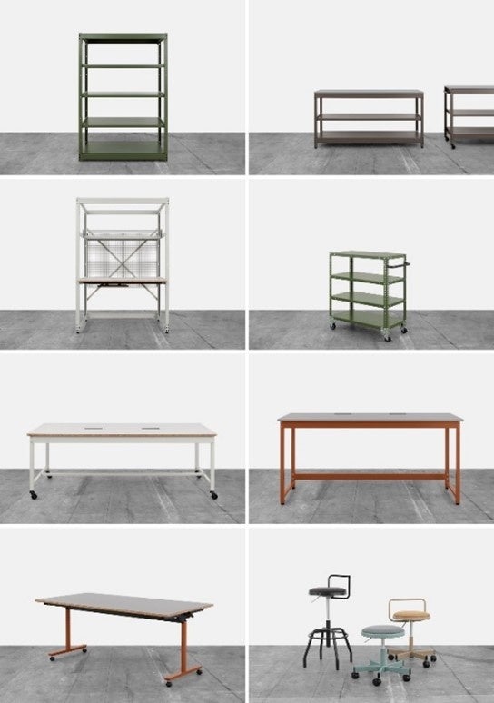 工場用什器をオフィス空間に調和するよう再編集した家具シリーズ。