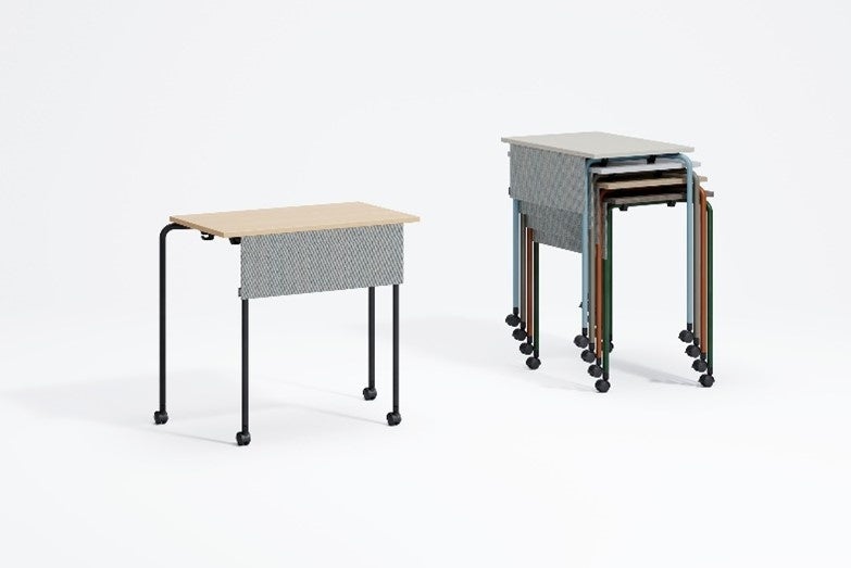 学習スタイルの多様化にフレキシブルに対応するデスクとして価値が高い。単体ではキャスター付きの使い勝手が良いシンプルなデスクであるとともに、組み合わせが簡易にでき、グループワークや作業テーブルなど学習の場で必要なシーンに対応できるところが嬉しい製品である。組み合わせの機能とスタッキング機能のために足位置が工夫されており、そこにこのデスクの愛らしさが感じられる。