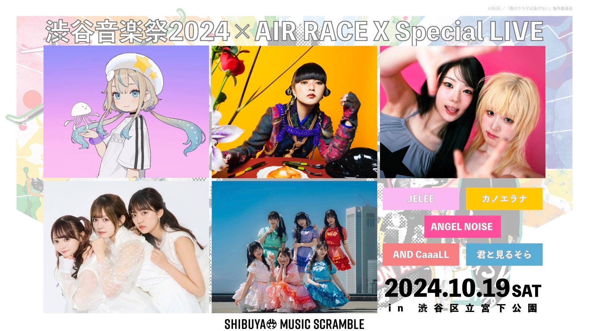 超次元モータースポーツAIR RACE X 2024シリーズ最終戦となる「AIR RACE X 2024 SHIBUYA Digital Round」、と音楽ライブ、そして渋谷を舞台とする大人気アニメ「夜のクラゲは泳げない」が10月19日(土)渋谷区立宮下公園にて、音楽とスポーツの祭典を開催いたします。XR 技術(AR / VR / MR)を活用した新たな体験をお楽しみください。