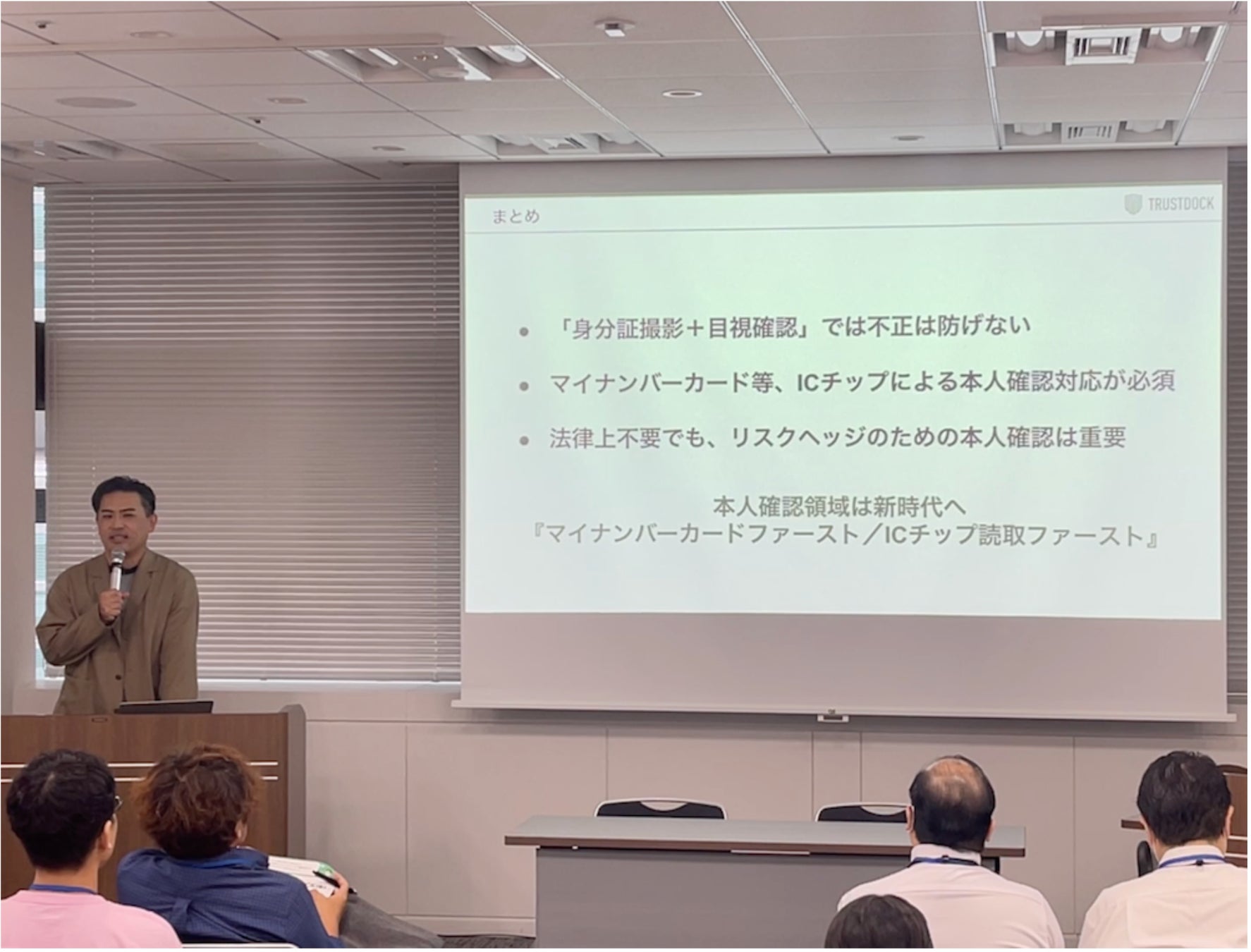「ここまでお伝えしましたとおり、身分証を撮影して目視で確認するというやり方では、本人確認の不正を防ぐのが現実的に困難になってきております。本人確認領域は新時代へと突入しています。これからは、マイナンバーカード等の中にあるICチップを読み取って本人確認を実施する手法が主流になります。ぜひ、マイナンバーカードファースト、ICチップ読取ファーストの視点で、本人確認方法を点検してみてください」