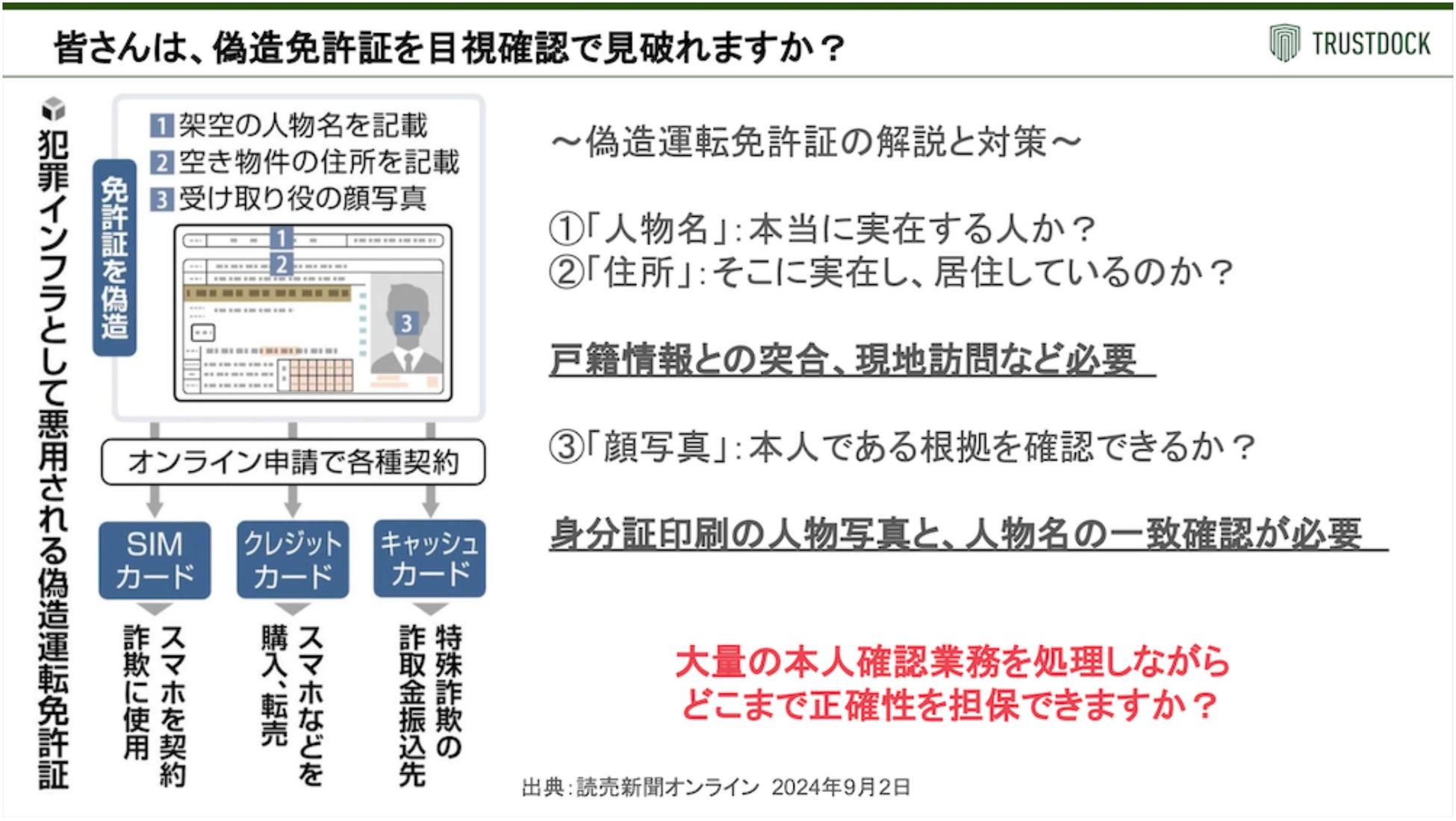 「ほとんどの方が問題ない中において、本の一部の不正をどれだけ正確に見抜くことができるか。これが、私たちがこれから直面する問題だと認識しています。ですので犯罪抑止の備えという観点でも、自社の本人確認方法を点検するタイミングに来ております」