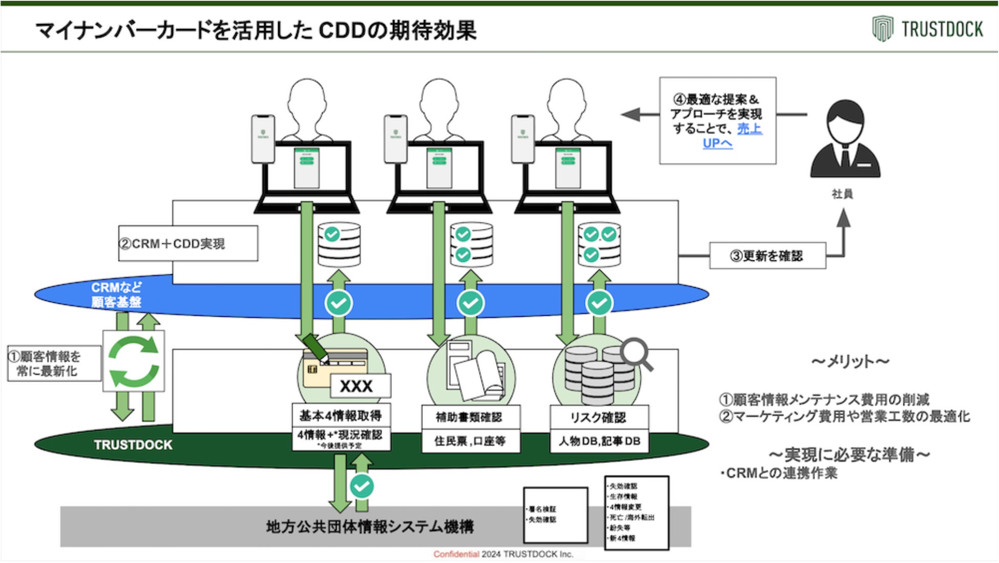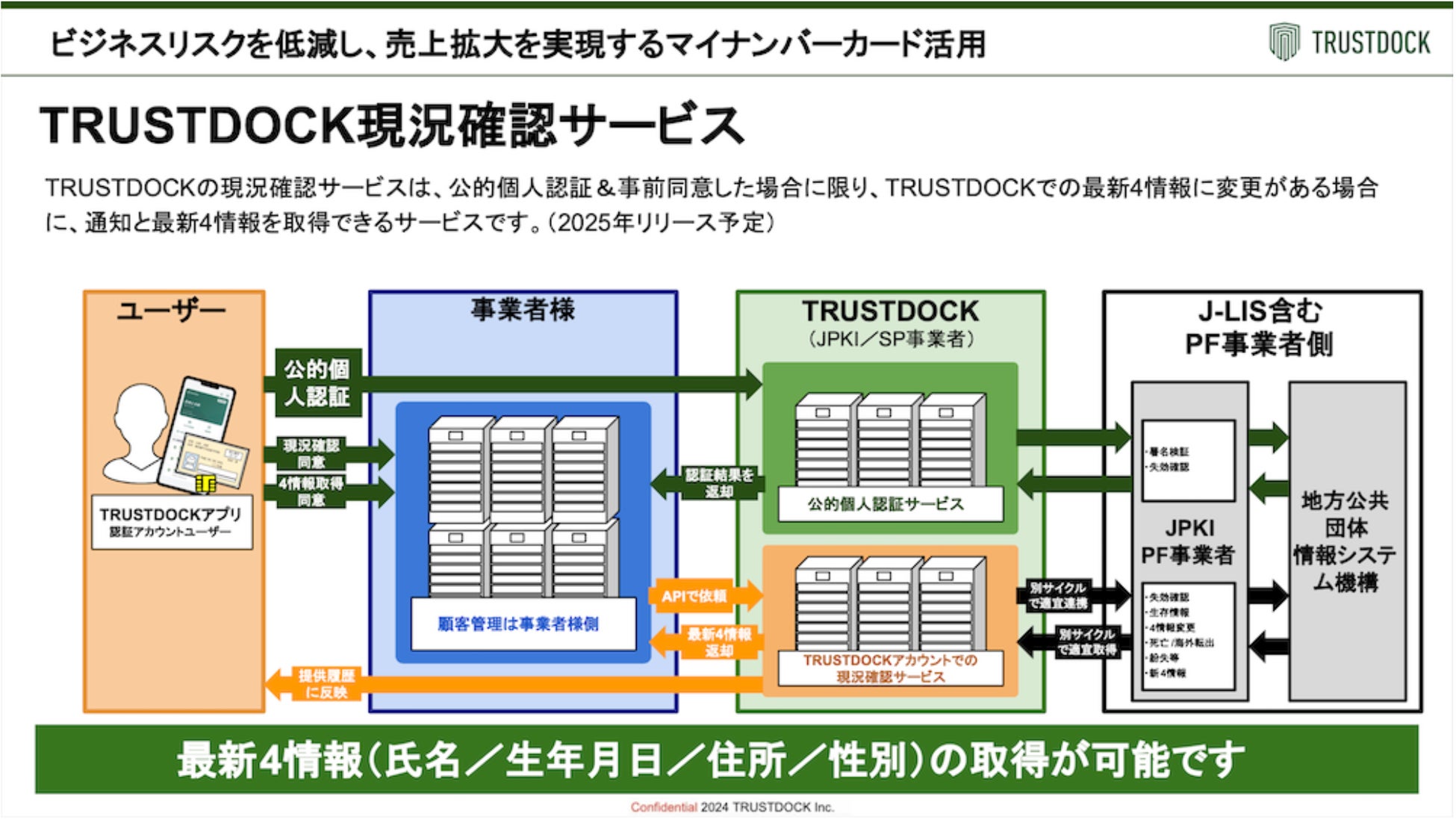 「この現況確認サービスと、お客様のシステム基盤を連携させることで、TRUSTDOCKがお客様に代わってJ-LISシステムの方に最新情報を常に取得しに行きます。これにより、お客様は基本4情報について顧客情報をメンテナンスすることなく、常に最新の情報を活用した施策を打つことができるようになります」