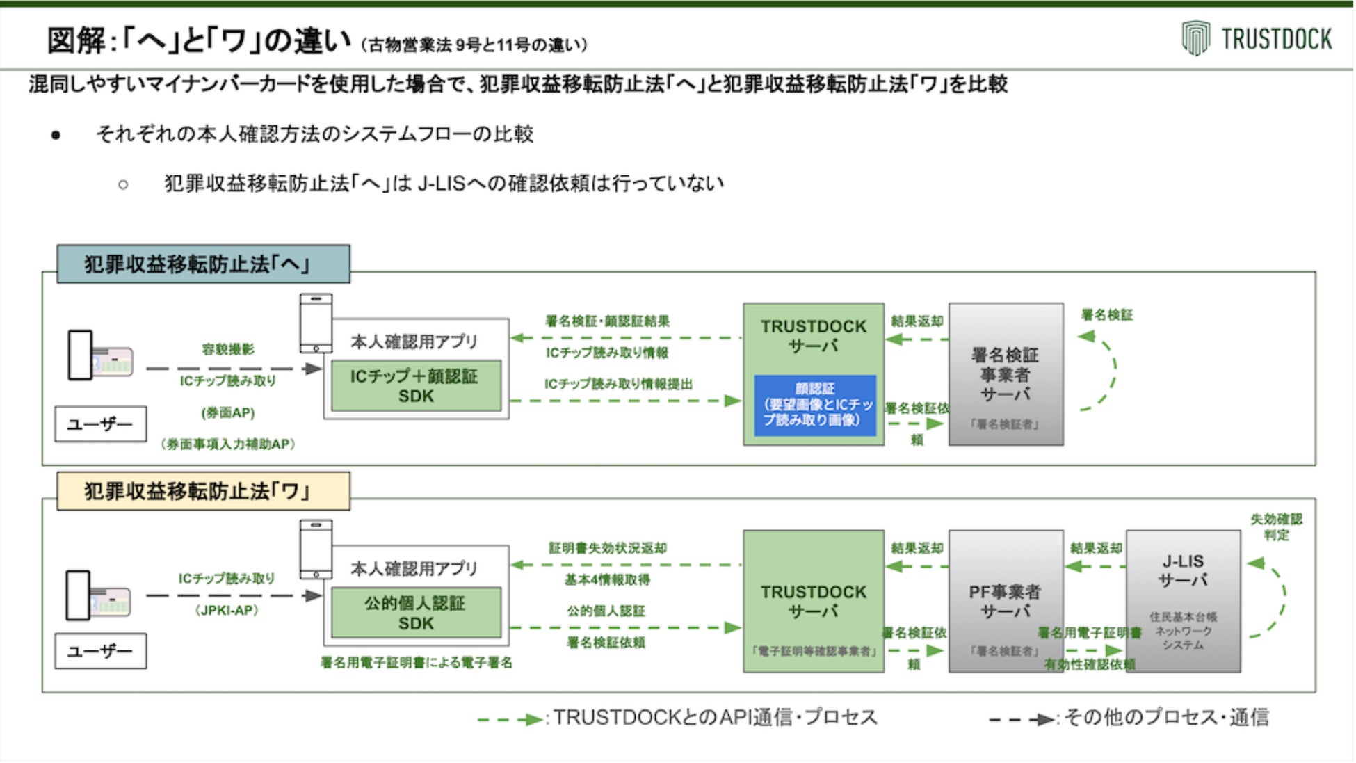 「へ方式でも署名の検証を技術的に行いますが、署名すら改竄する形で本人確認書類(運転免許証の中のICチップ)を偽造されてしまうと、本物だということで本人確認をパスしてしまいます。Netflixドラマ『地面師たち』をご覧になった方であればお分かりかと思います。一方で公的個人認証は、署名の検証に際してJ-LISという一種の国の機関に署名の確認を都度入れることになります。J-LISのデータベースを改竄するのは非常に困難で現実的に無理なので、もし導入を検討されるのであれば、マイナンバーカードを使った公的個人認証をTRUSTDOCKでは推奨しております」