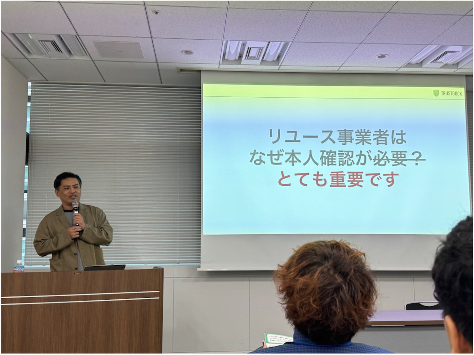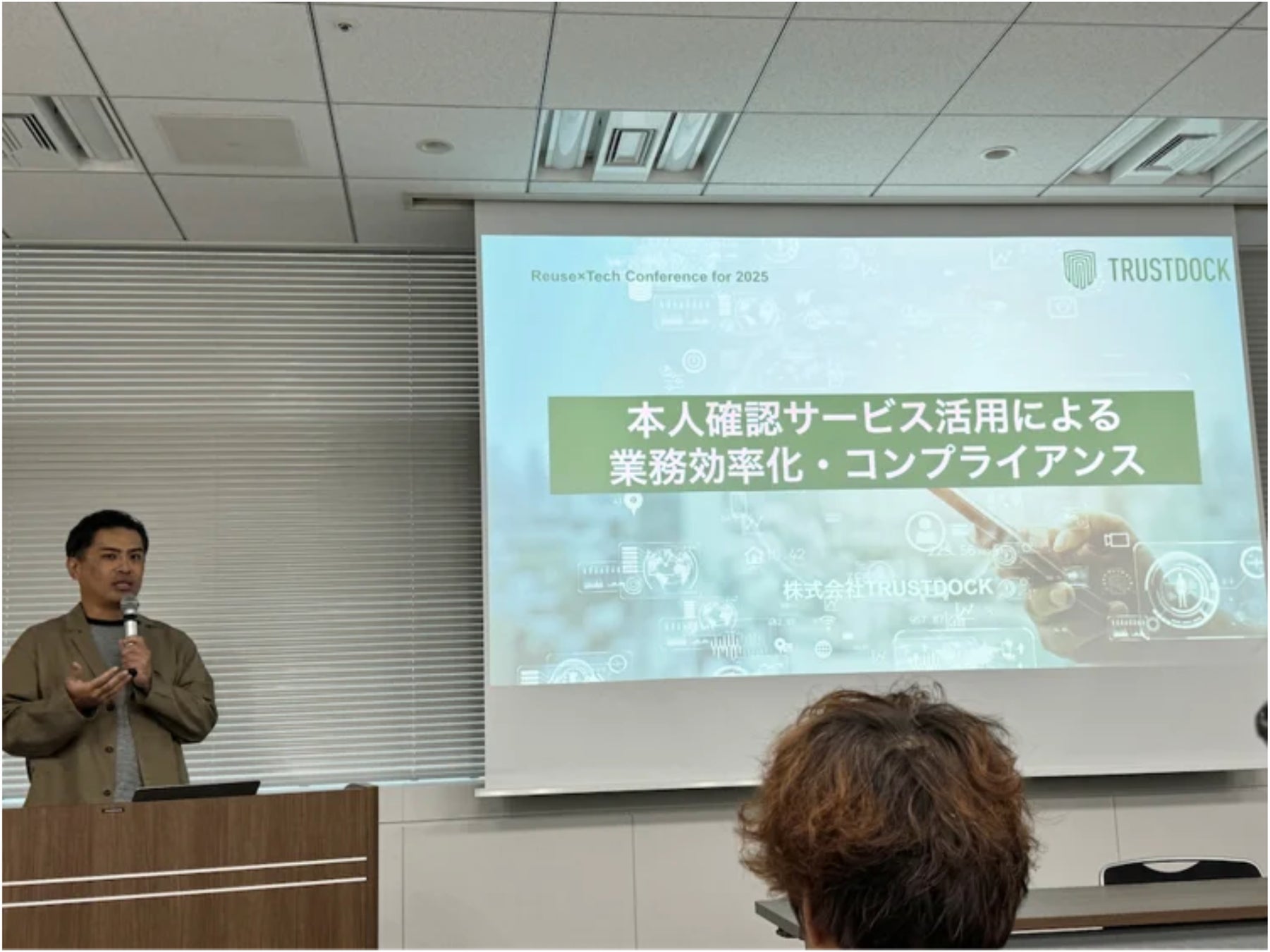 TRUSTDOCKも昨年度に引き続き本イベントに参加し、リユース業界におけるeKYC活用という切り口で「本人確認サービス活用による業務効率化・コンプライアンス」というセッションを開催。当日は、KYC事業部 セールスグループ マネージャーの小野 大地より発表がなされました。