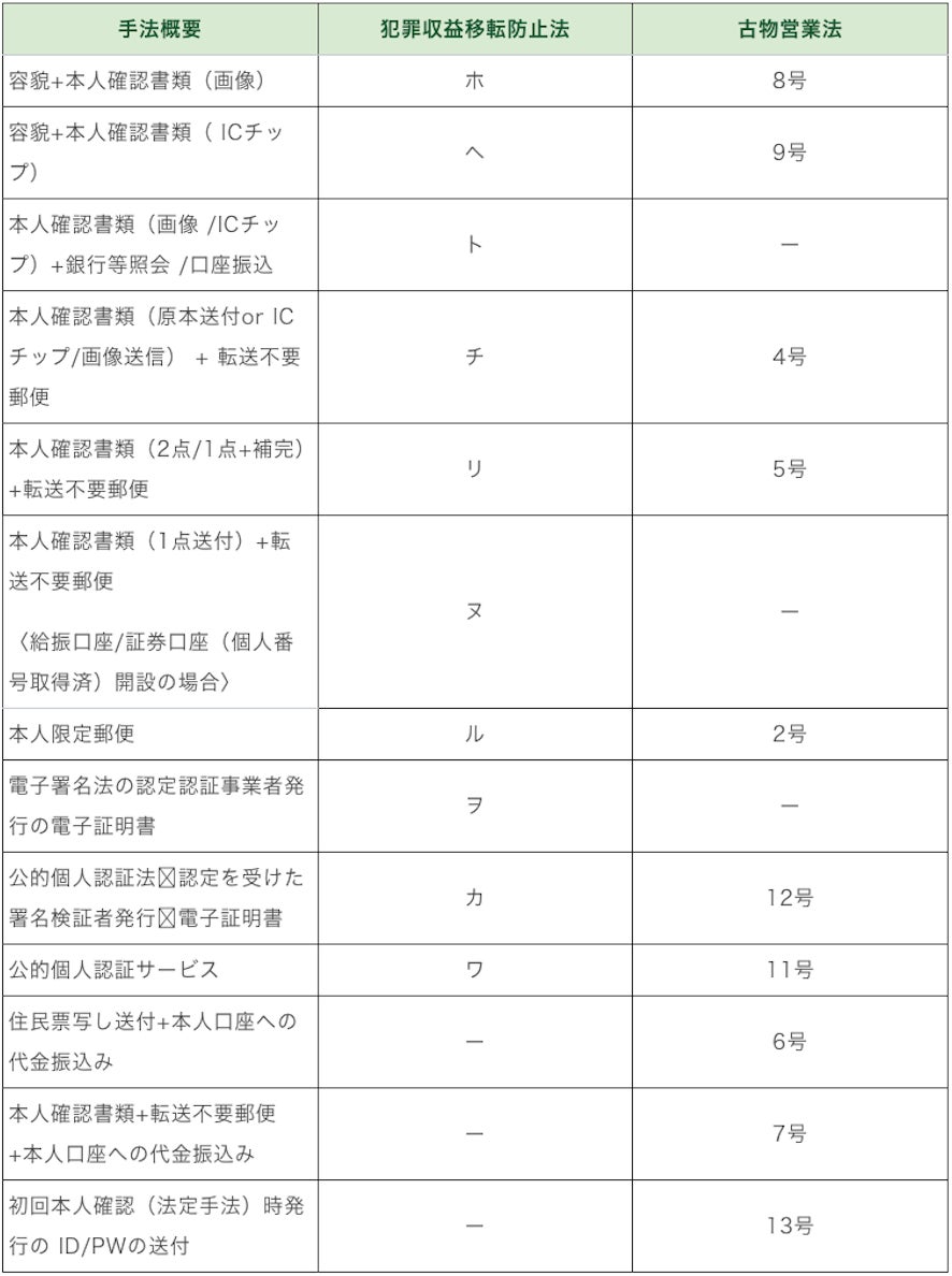 本人確認の手法については、犯罪収益移転防止法は施行規則6条1項1号に、古物営業法は施行規則15条3項にて、それぞれ定められています。その中の「非対面手法」についてまとめたものが以下となります。