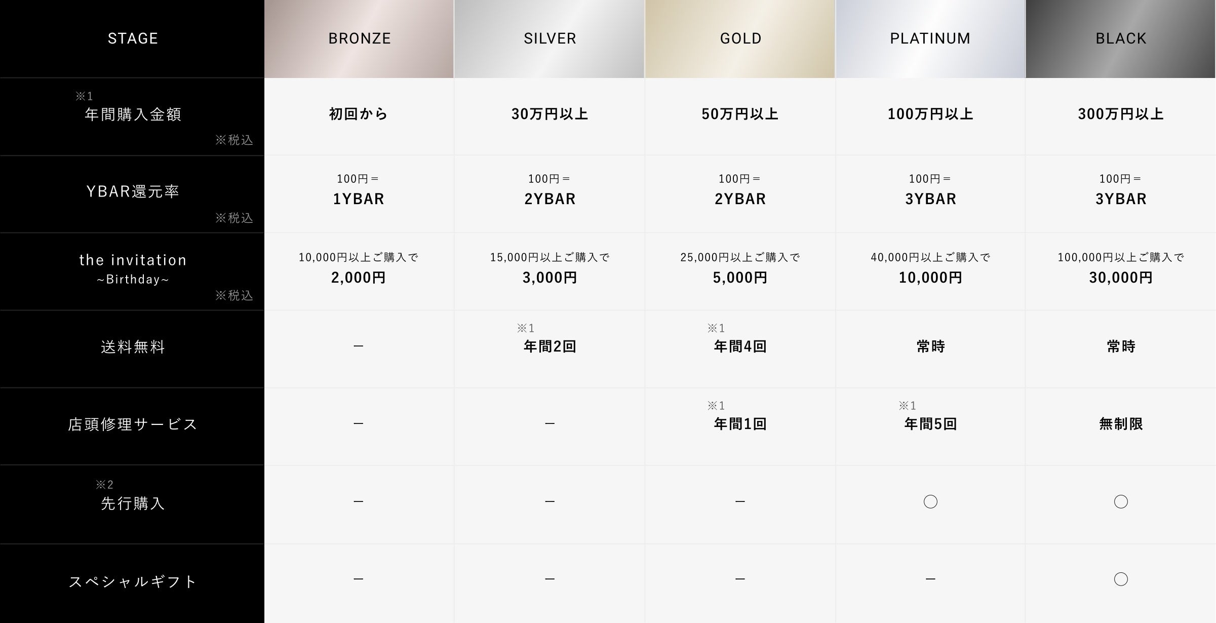 ※既にTHE SHOP YOHJI YAMAMOTOにご登録いただいている方は、自動的に本プログラムへ移行され、今までお貯めいただいたYBARも継続してご使用可能です。直近1年間のお買上げ金額によって、該当のステージに振り分けられ、特典を即日ご利用いただけます。