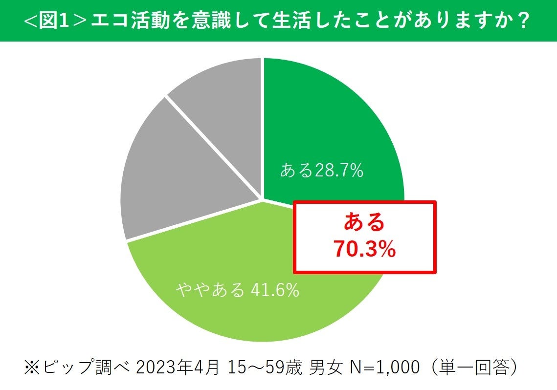 現在、多くの生活者が環境配慮への意識を持ち様々な取り組みを行っていますが、その取り組みは多岐に渡ります。ピップが行った調査によると、70.3%の人が「エコ活動を意識して生活したことがある」と回答しました<図1>。2022年3月に同調査を実施した際は、66.3%だったことから、1年で4%の方が、エコ活動を意識して生活するようになったことがわかりました。