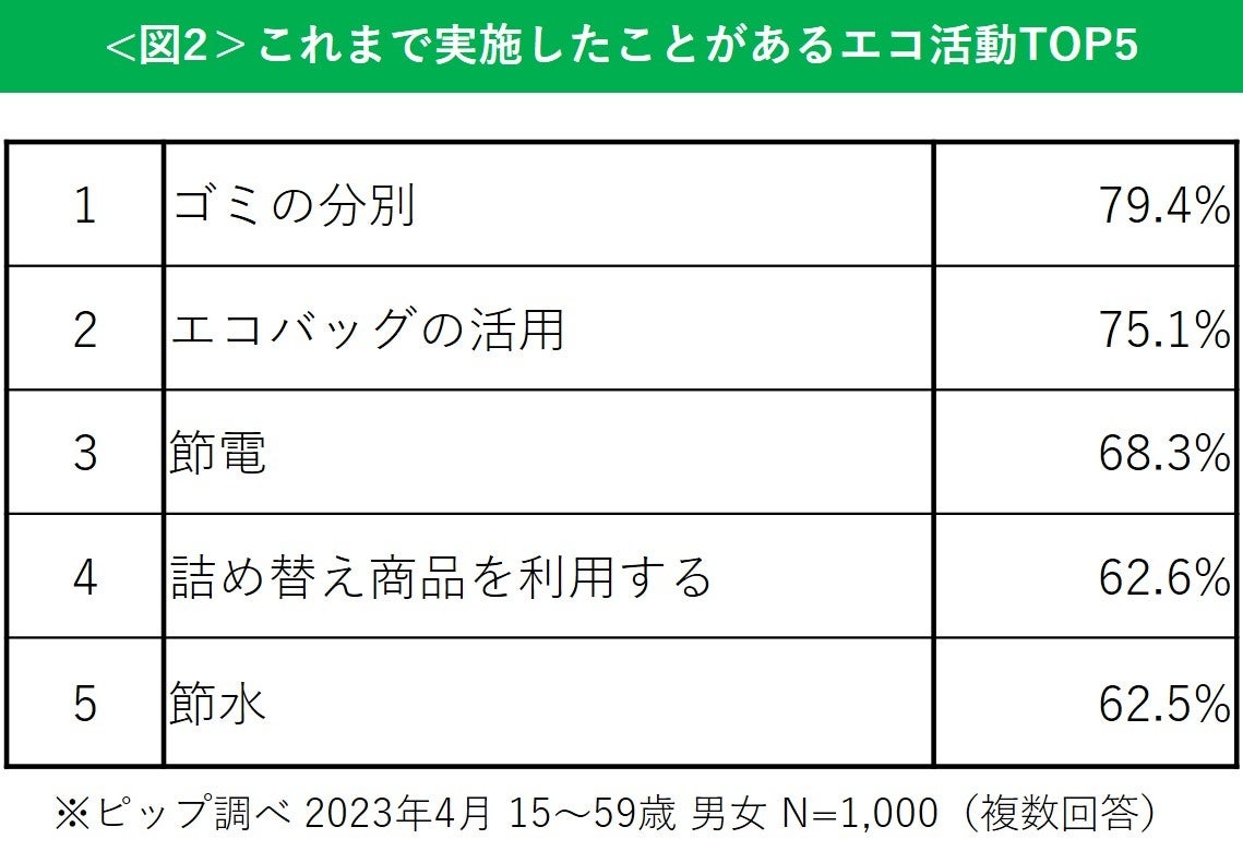 また、これまで実施したことがあるエコ活動としては、「ゴミの分別(79.4%)」が最も多く、次いで「エコバッグの活用(75.1%)」が多い結果となりました<図2>。その他にも「節電(68.3%)」「詰め替え商品を利用する(62.6%)」「節水(62.5%)」など上位5つに入る全てが、昨年の同調査の結果を7%~10%程度上回っており、生活者の環境意識が高まっていることが伺える結果となりました。